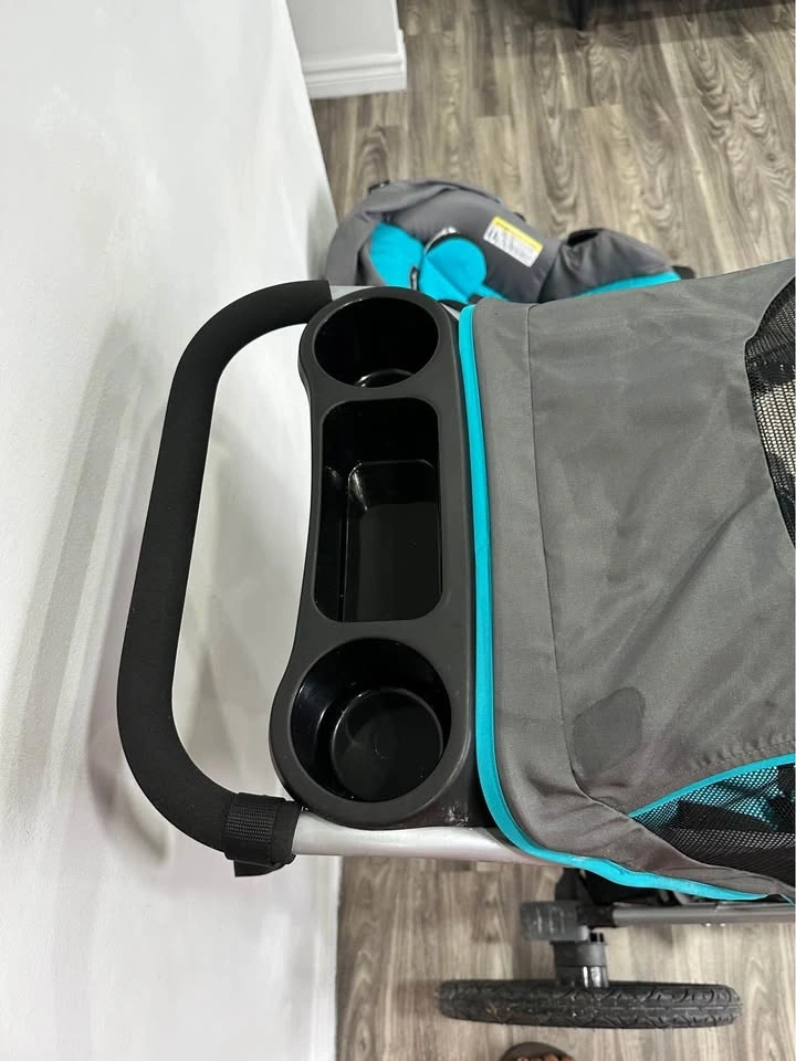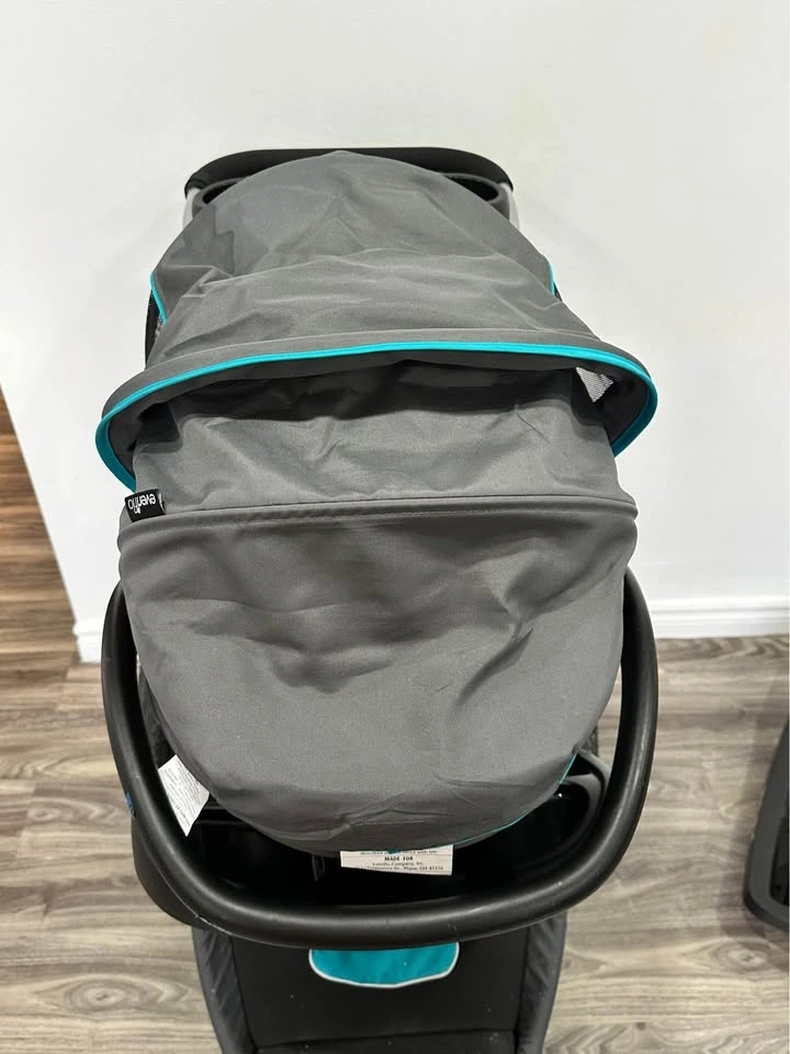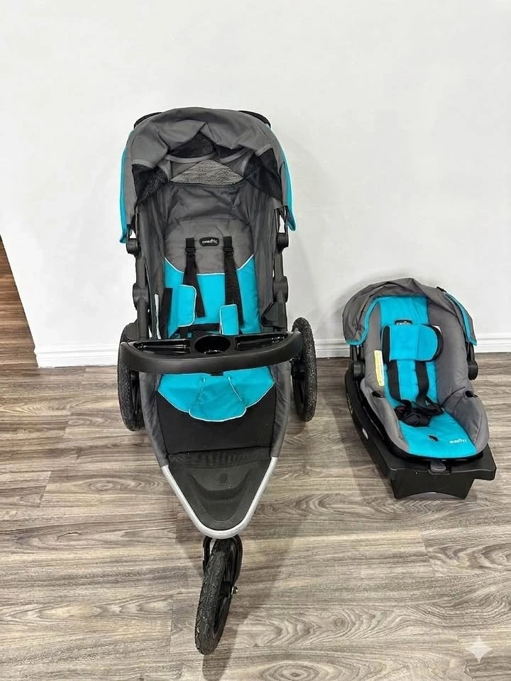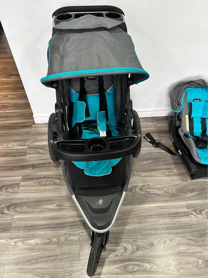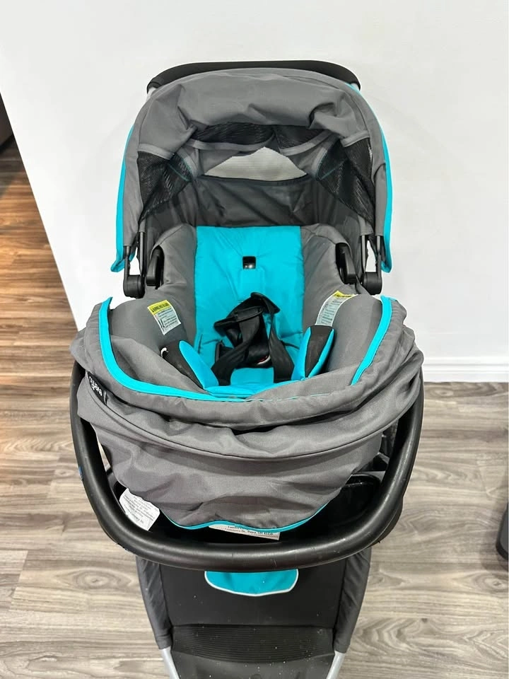 Move freely with baby in tow. Lightweight jogger stroller + ultra-light infant car seat. Smooth all-terrain ride with suspension and air-filled tires. Front wheel lock for stable runs. One-step compact fold, self-standing. Breathable mesh for airflow. Large storage + parent cupholders + child snack tray. Car seat safety tested beyond federal standards.