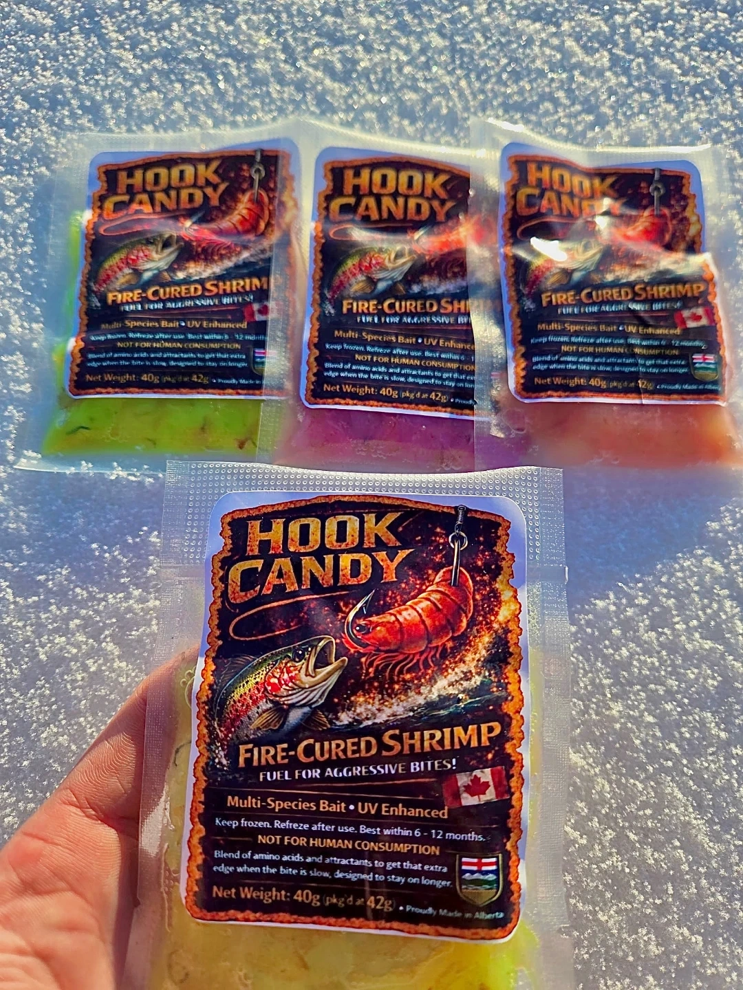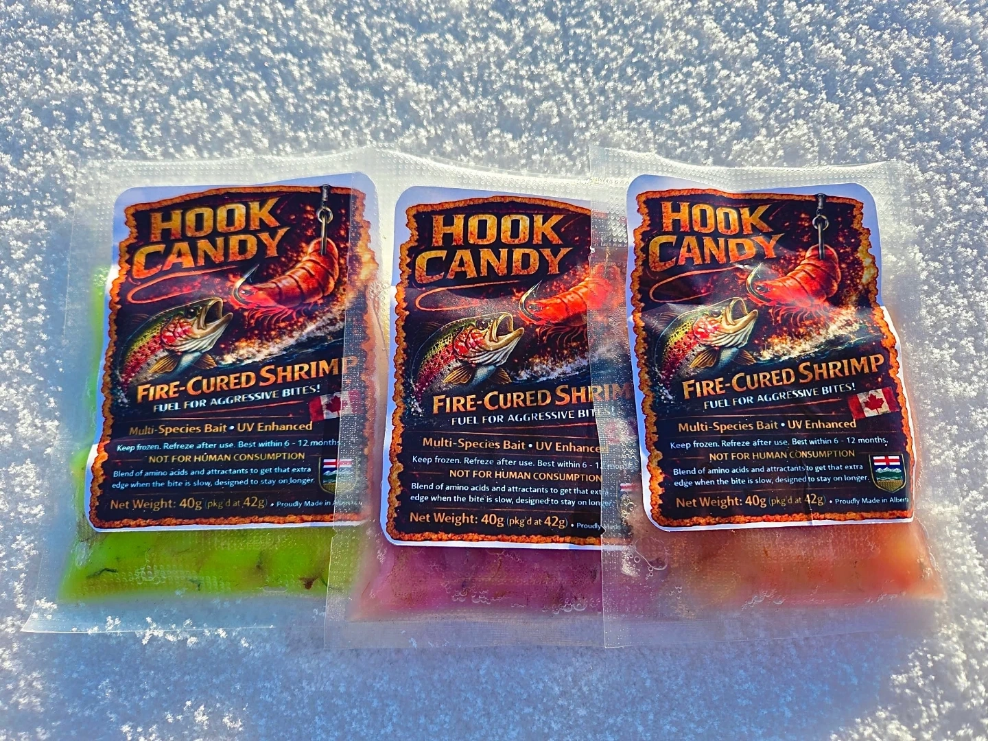Hook Candy β Small-batch cured shrimp bait, crafted for cold water and hard bites.