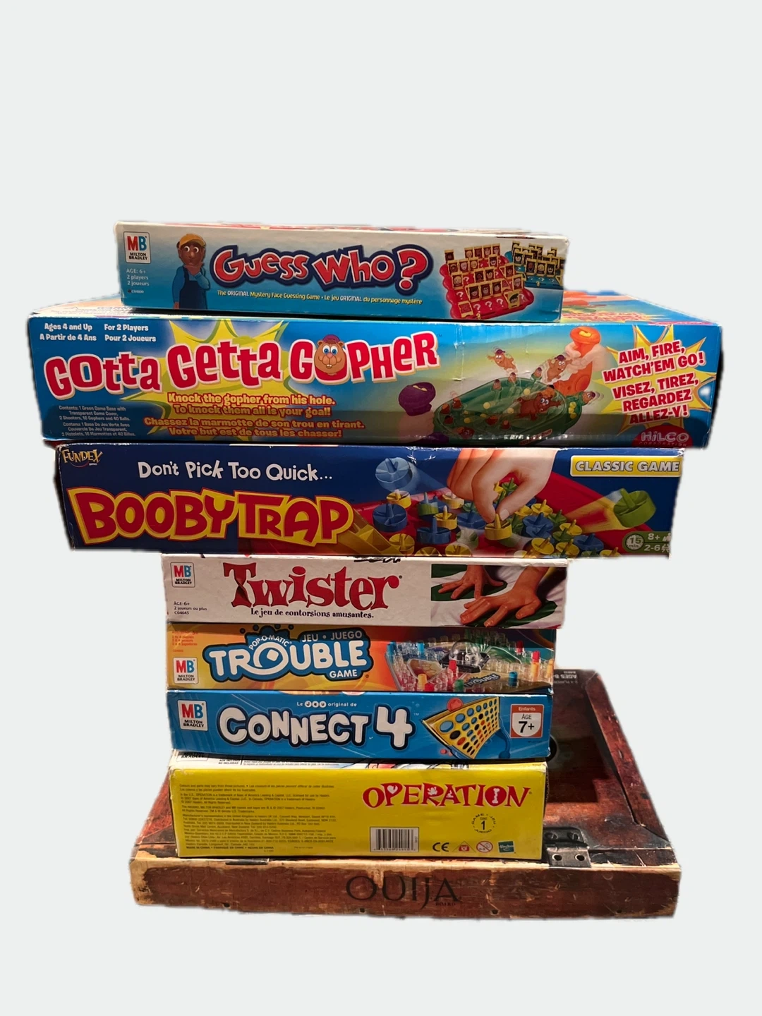 Collection of classic board games including Guess Who?, Gotta Getta Gopher, Booby Trap, Twister, Trouble, Connect 4, Operation, and Ouija. All are well-known family games. These games are great for a family game night! $4 EACH.