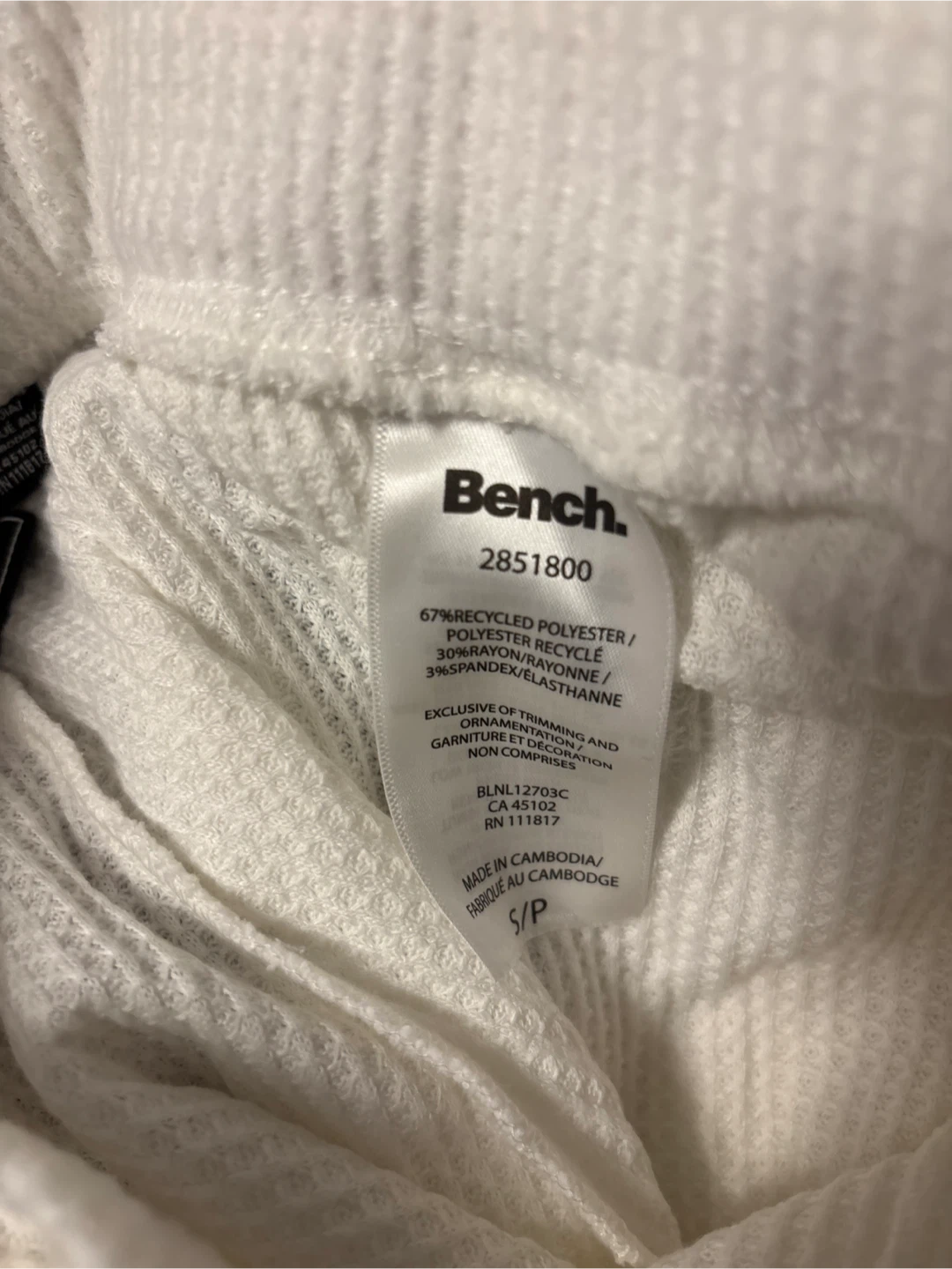 Comfortable Bench lounge pants made from a recycled polyester blend. They're a size S/P and come in white. These pants are perfect for relaxing at home.