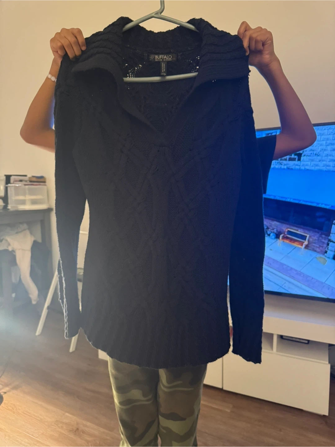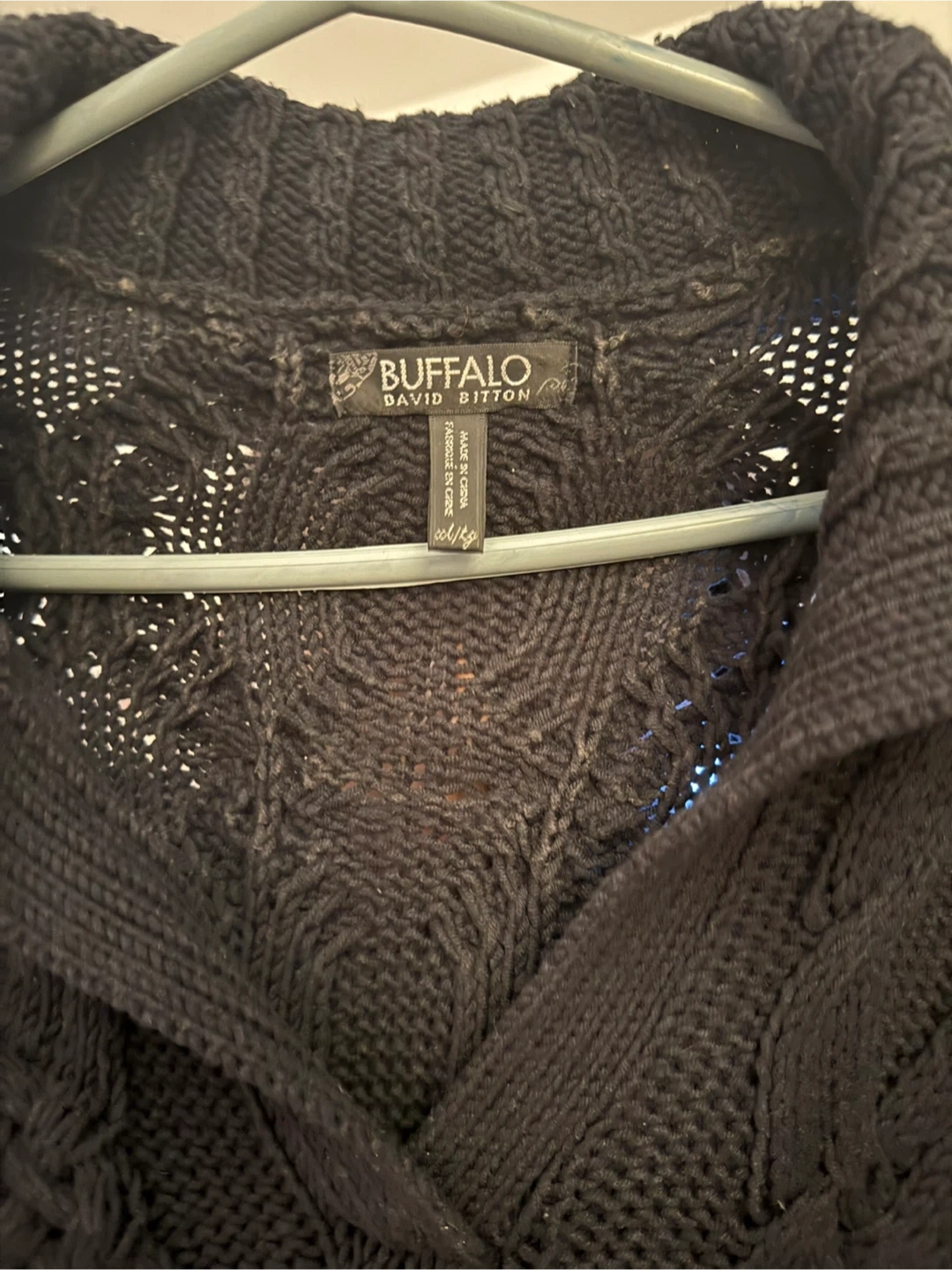 Selling a women’s Buffalo David Bitton black sweater in size XL. It's a cozy and stylish piece that would be great for layering or wearing on its own. The sweater has a unique knit pattern and a comfortable fit