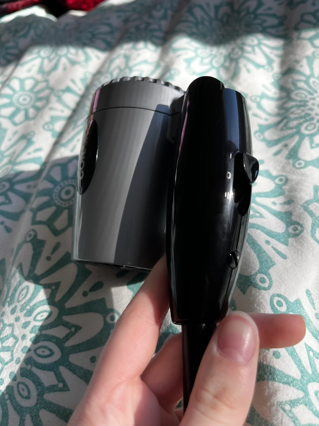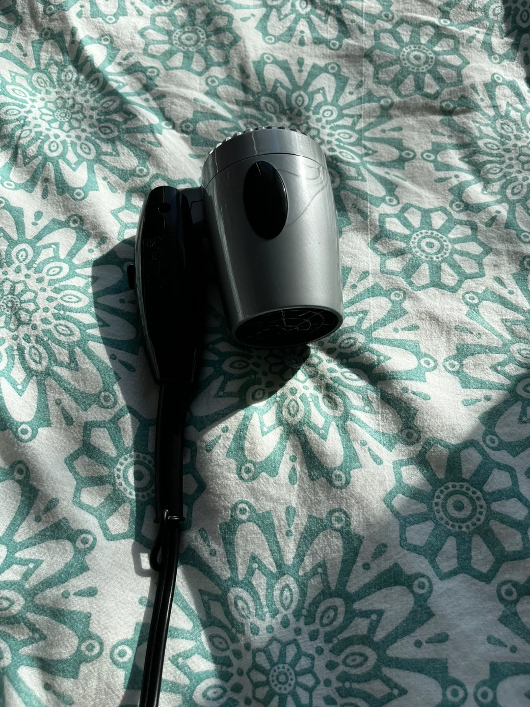This is a Conair compact hair dryer. It's silver and black with a foldable handle. Two speed settings are available.