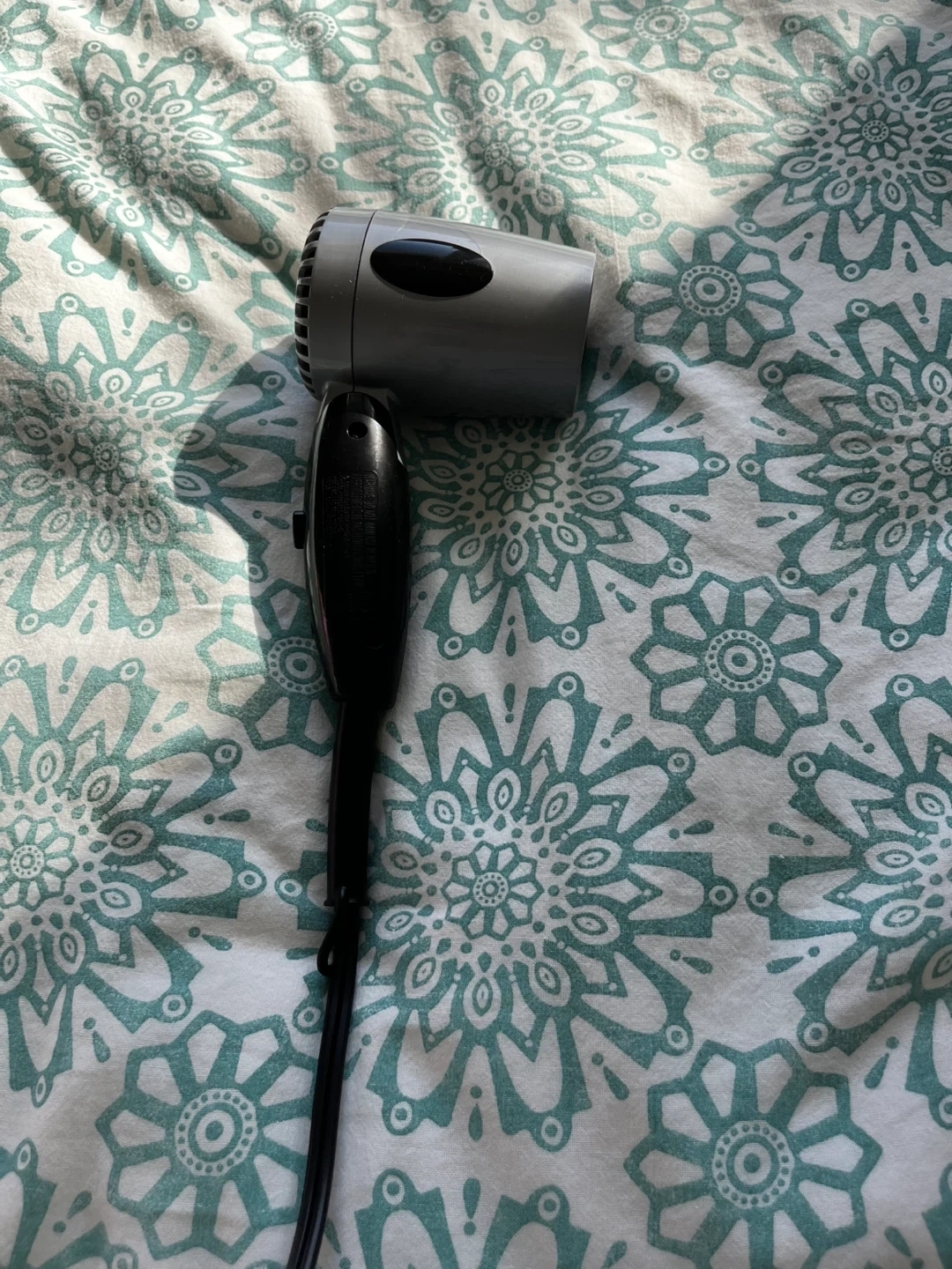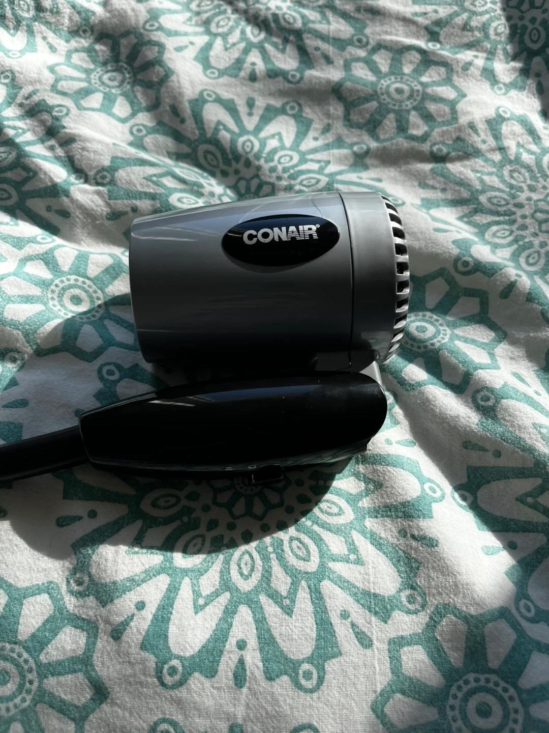 This is a Conair compact hair dryer. It's silver and black with a foldable handle. Two speed settings are available.