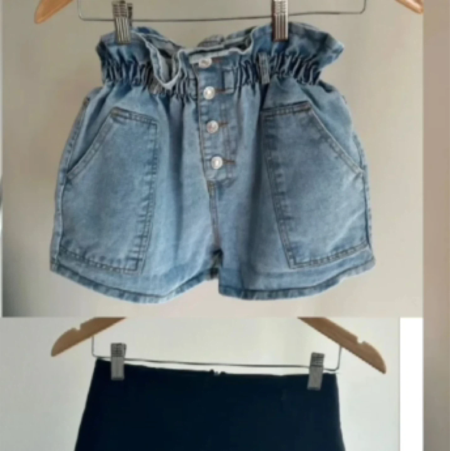Light wash denim shorts with a paperbag waist and button-up front. Pockets on the front and back. Elasticated waistband with a tie detail. These shorts are made of cotton.