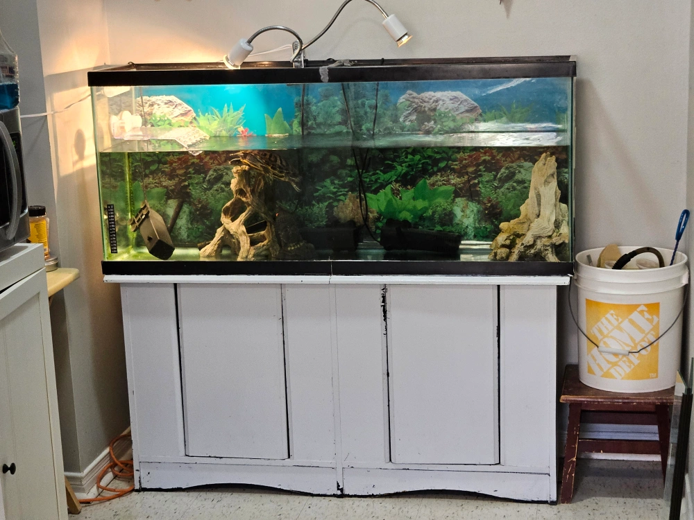 60-gallon aquarium with stand, as is. Does not includes lights or ornaments. Some putty was used as sealant for the top frame (visiable in 2nd photo). Lots of storage underneath. Good for turtles or fish.