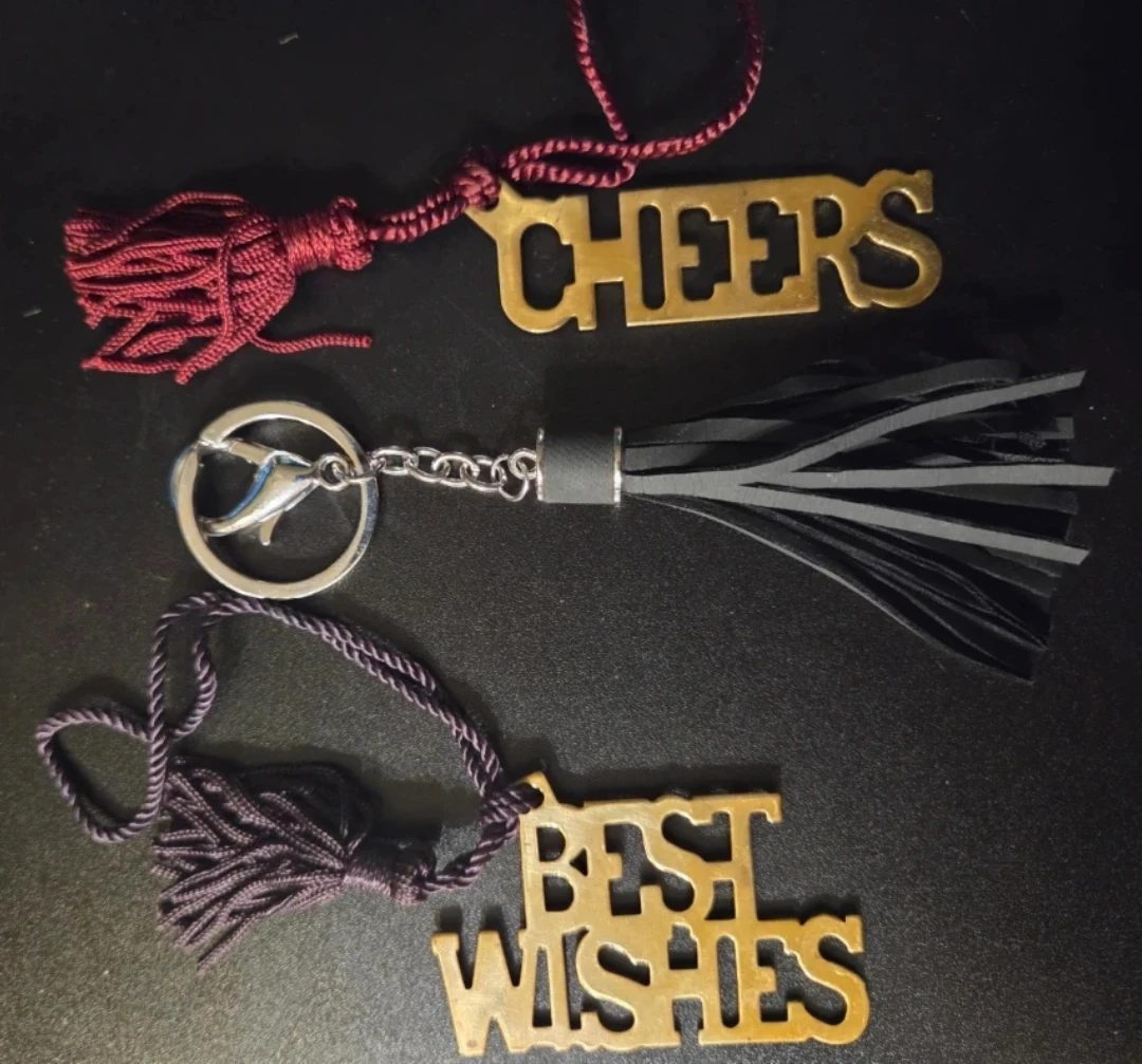 This set includes three decorative tassels, each with a unique metal charm. One charm says 'CHEERS', another says 'BEST WISHES', and the third is a keyring with a black leather tassel. They're great for adding a personal touch to bags or keys!