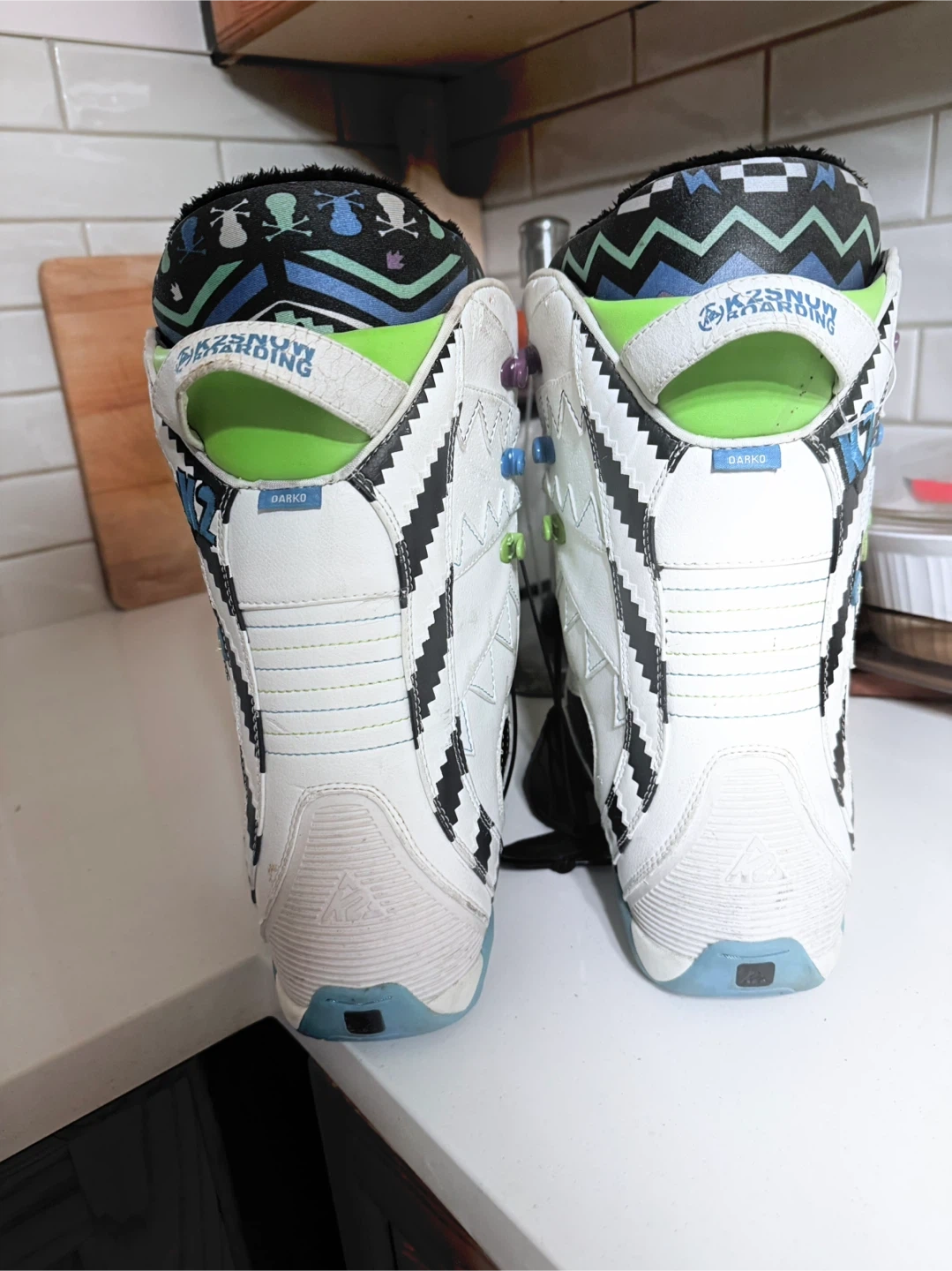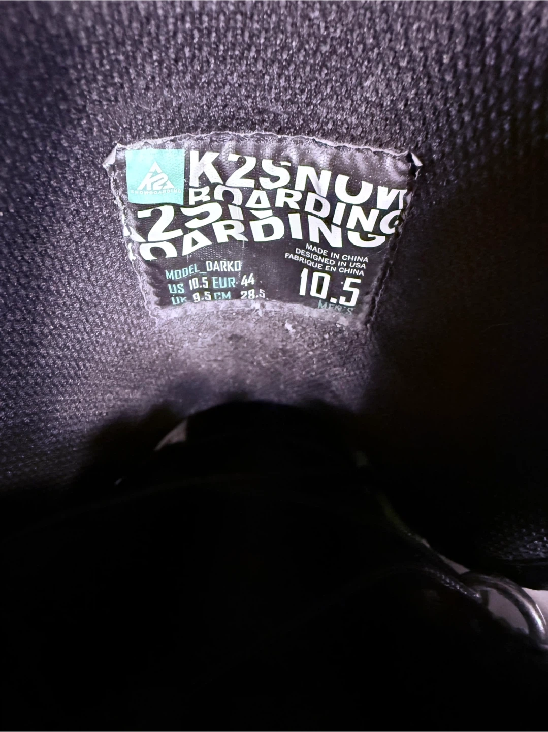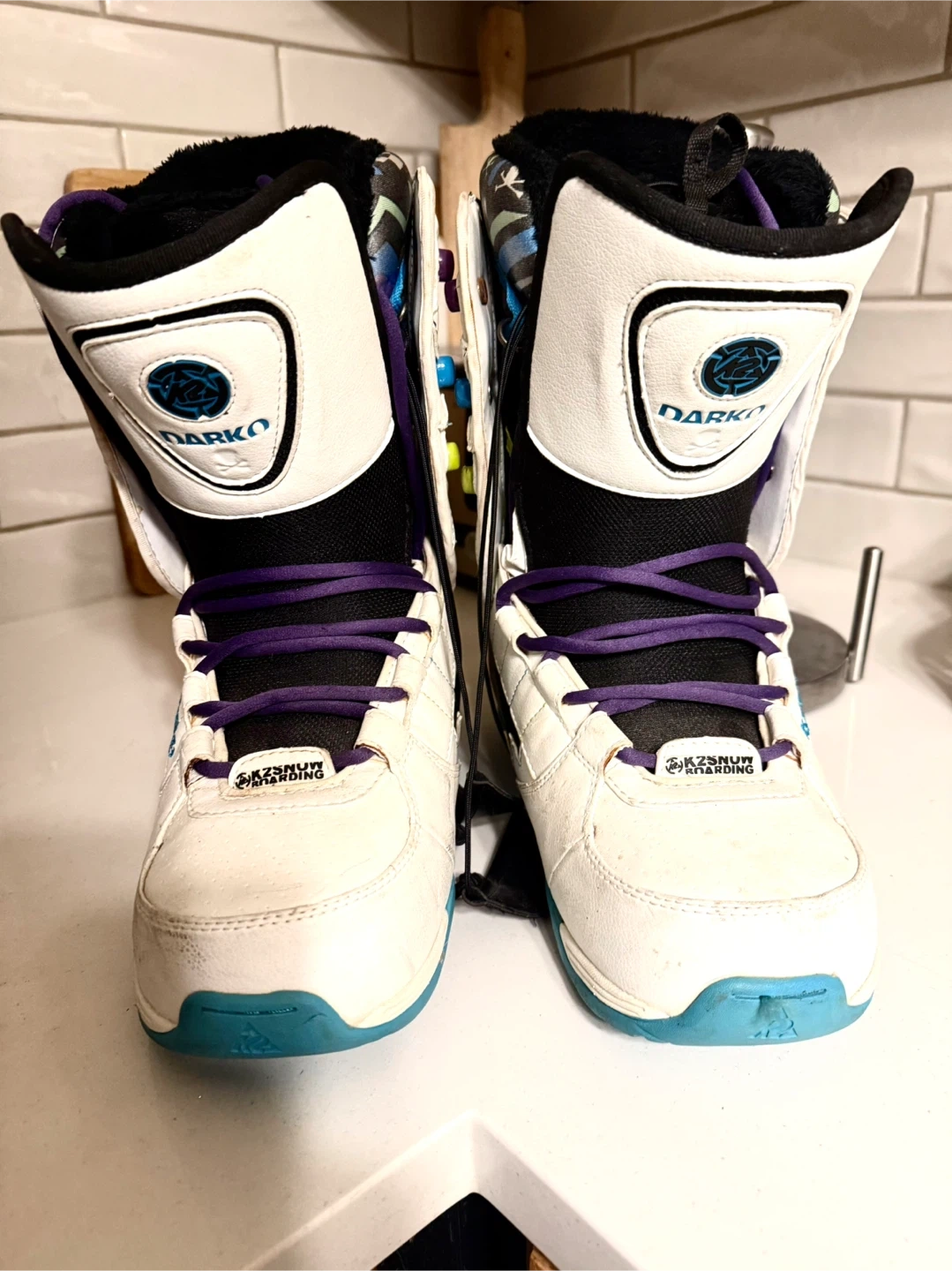 Beautiful K2 Darko snowboard boots in white with purple laces. Model is Darko, size is US 10.5 (EUR 44, These boots offer a comfortable fit for hitting the slopes.