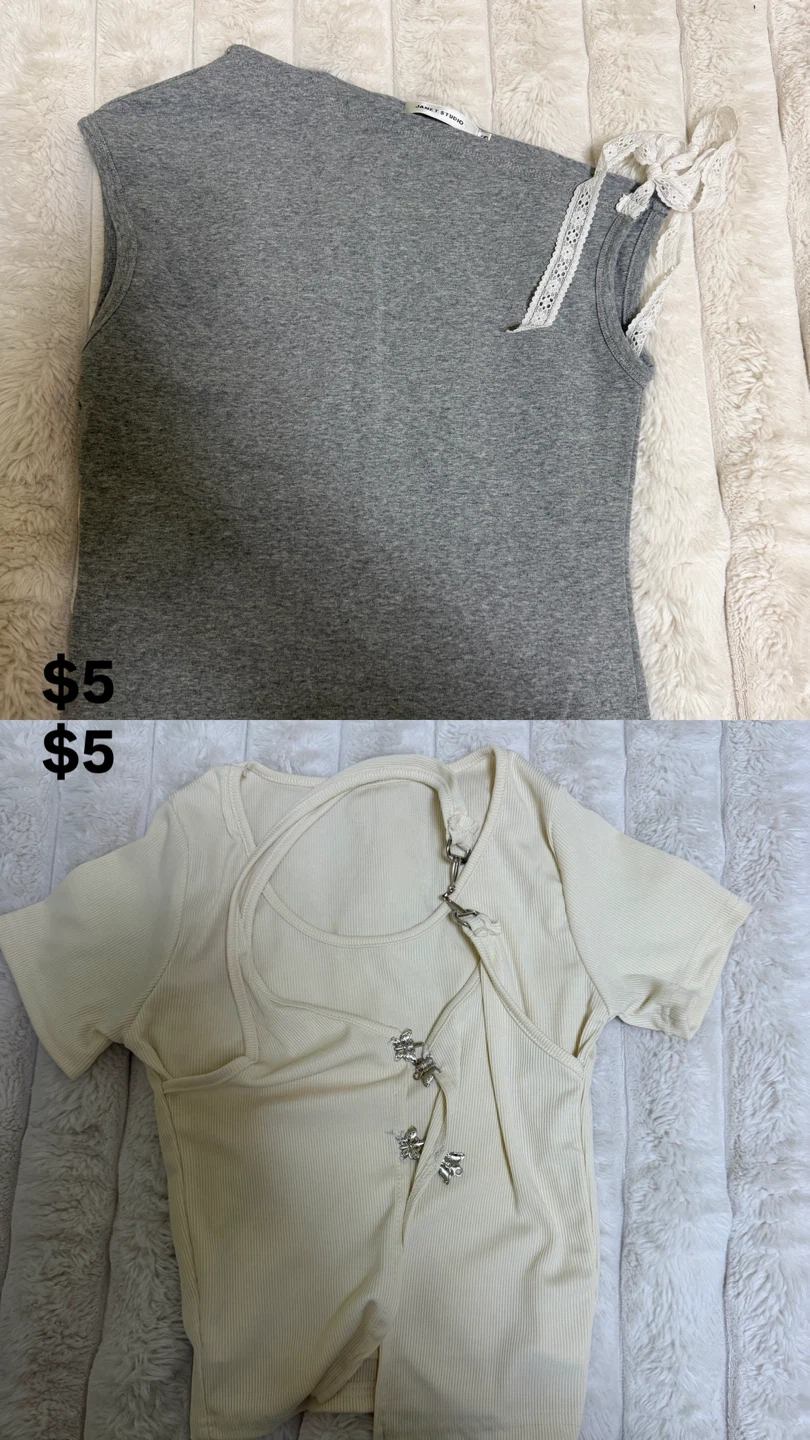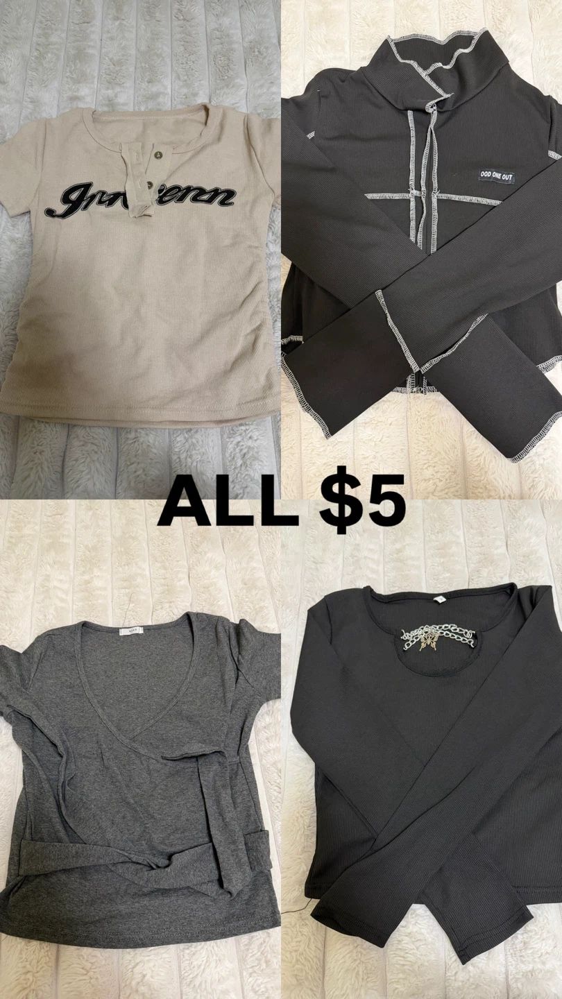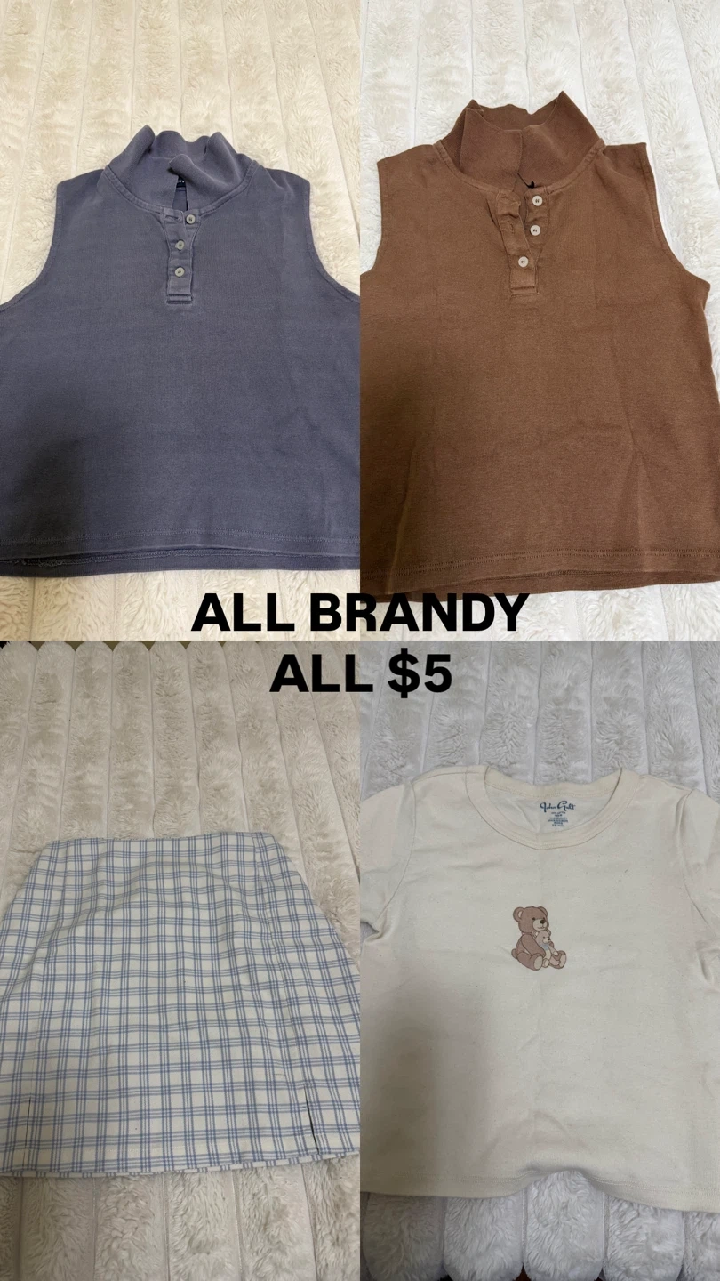 A variety of tops from Brandy Melville and other brands are available. Prices vary, with many items listed at $5. Some items are size S, M, XS, or 2XS. (Prices on the photo)