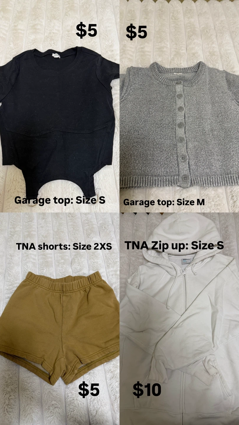 A variety of tops from Brandy Melville and other brands are available. Prices vary, with many items listed at $5. Some items are size S, M, XS, or 2XS. (Prices on the photo)