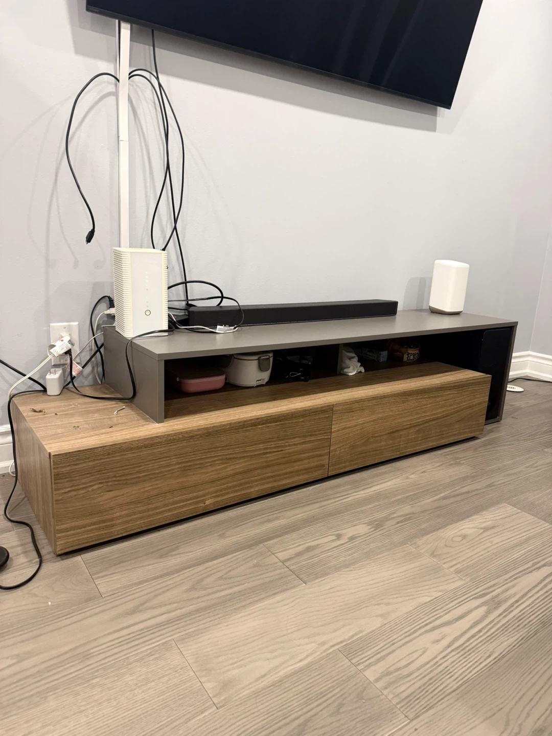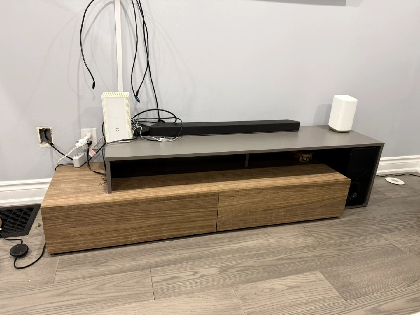 This entertainment unit features a sleek grey top shelf with two large wooden drawers below. It offers ample space for media devices and storage. The unit's modern design complements any living room setup.