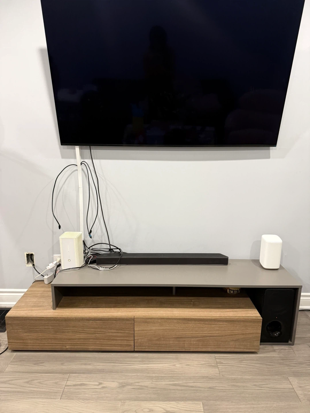 This entertainment unit features a sleek grey top shelf with two large wooden drawers below. It offers ample space for media devices and storage. The unit's modern design complements any living room setup.