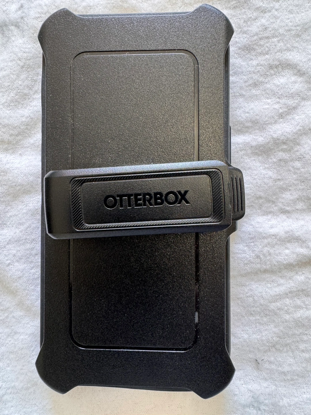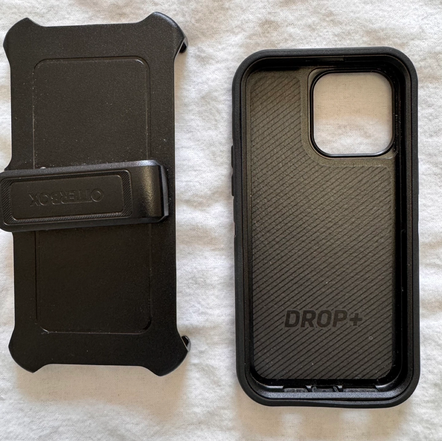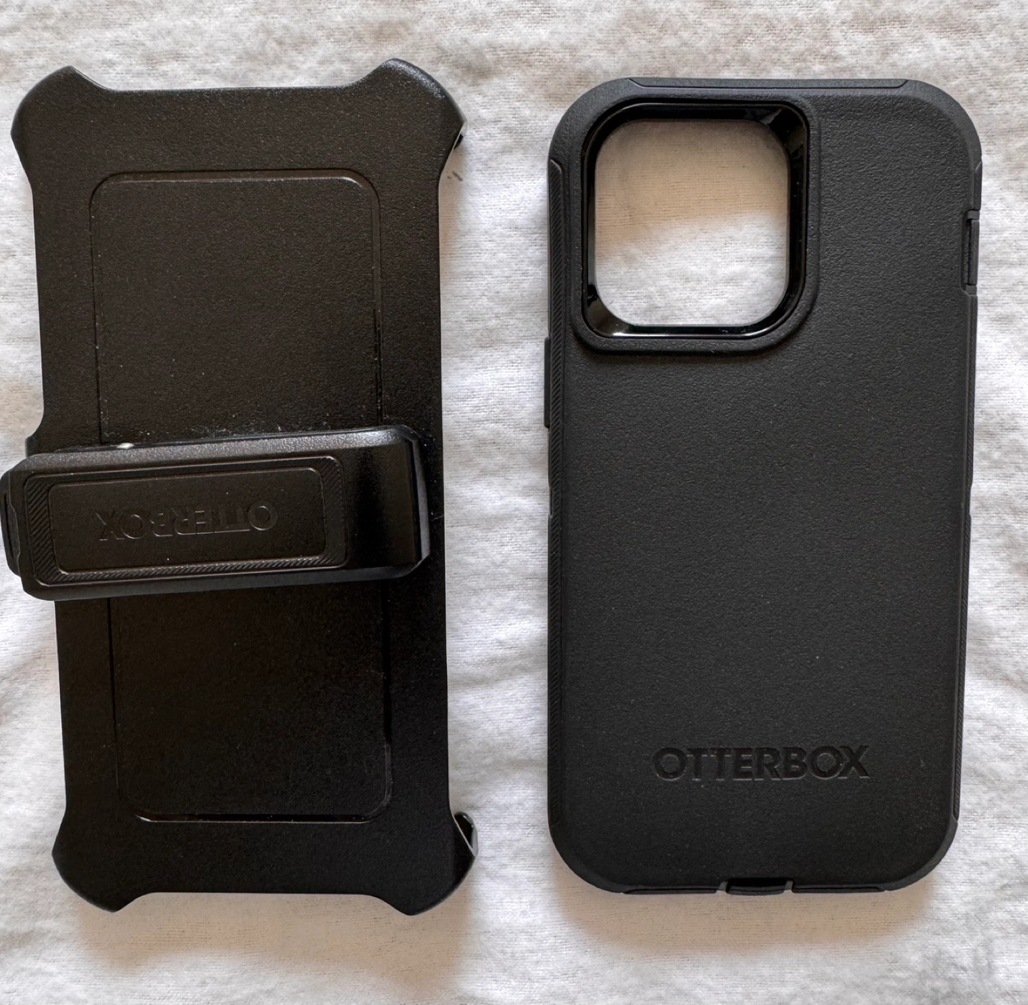OtterBox case for iPhone 14 Pro Max. Defender Series case with belt clip. Drop+ Series case. Black colour.