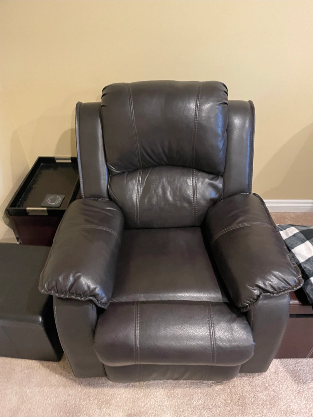 Comfortable dark brown recliner chair and loveseat. Padded headrest and armrests for extra comfort. Faux leather material.