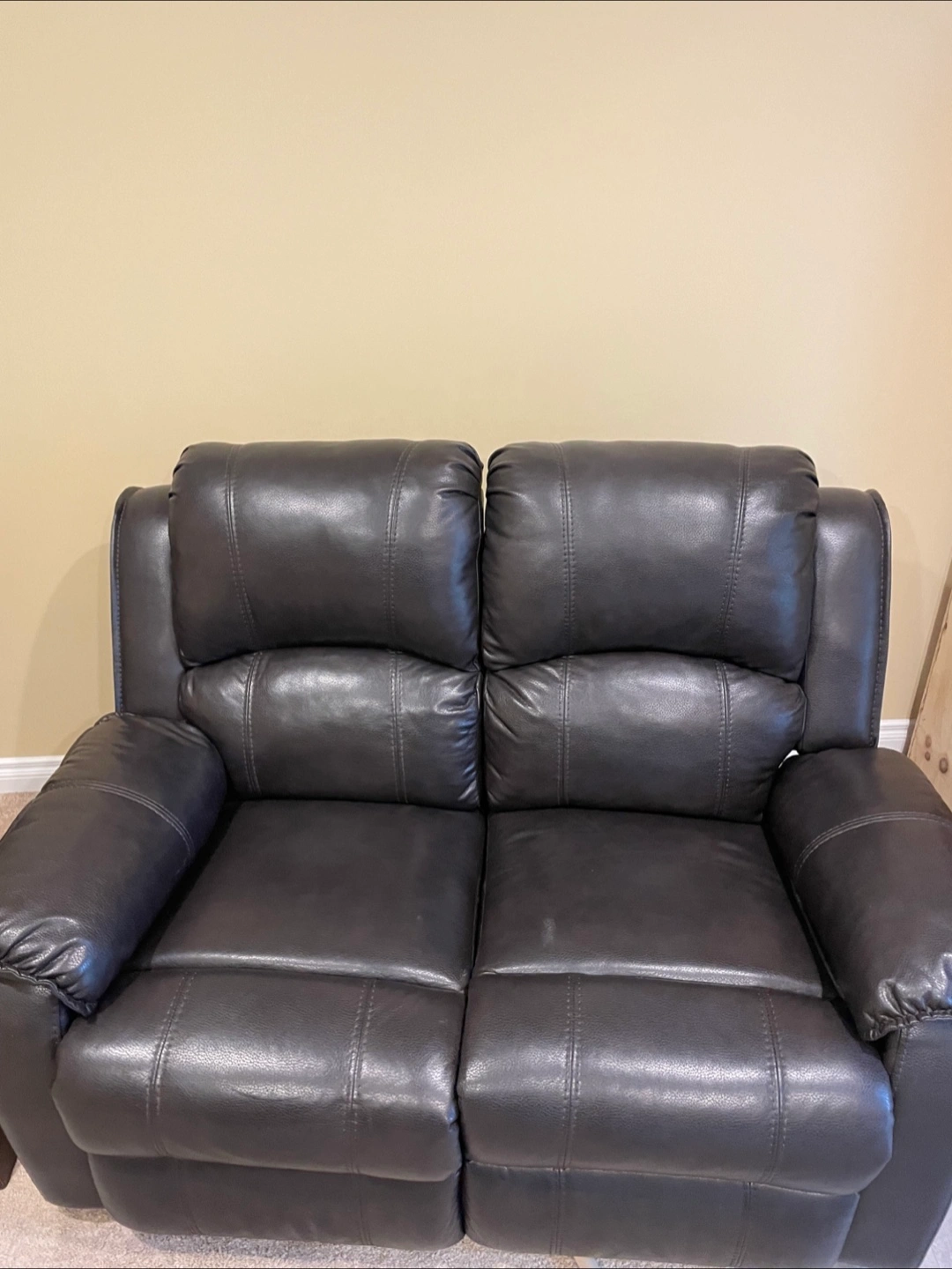 Comfortable dark brown recliner chair and loveseat. Padded headrest and armrests for extra comfort. Faux leather material.