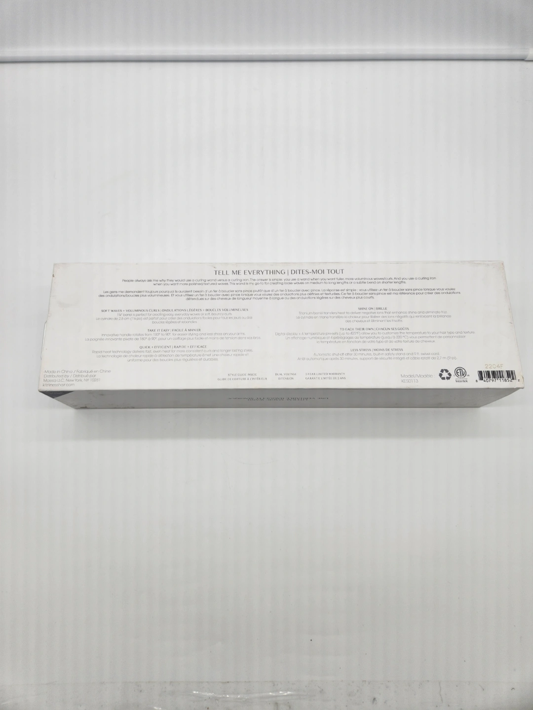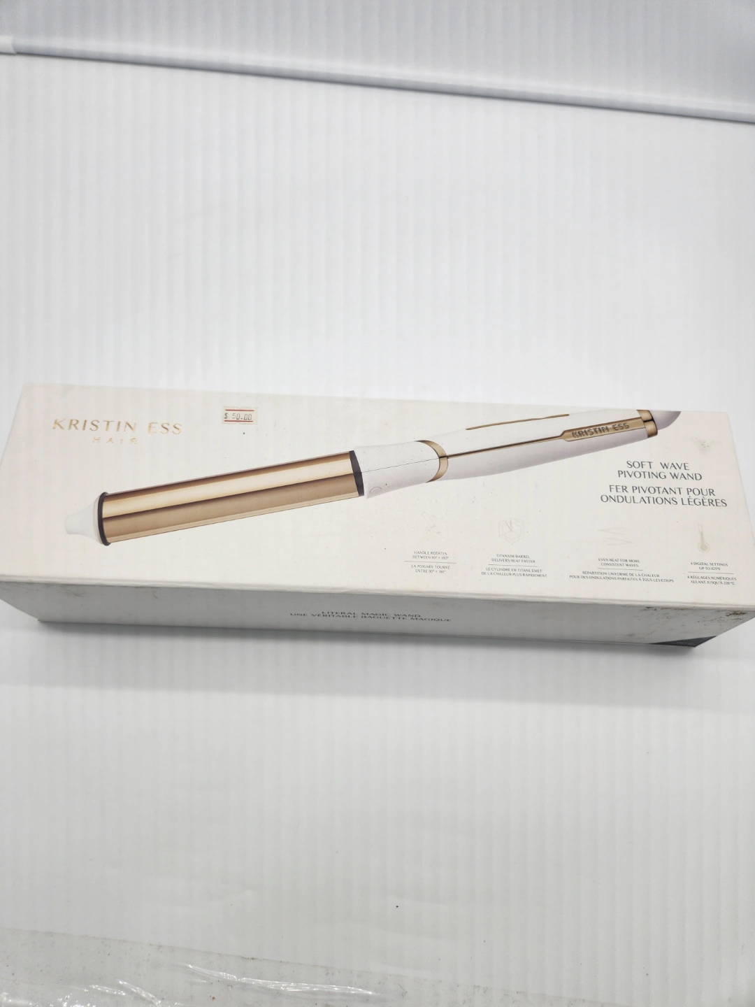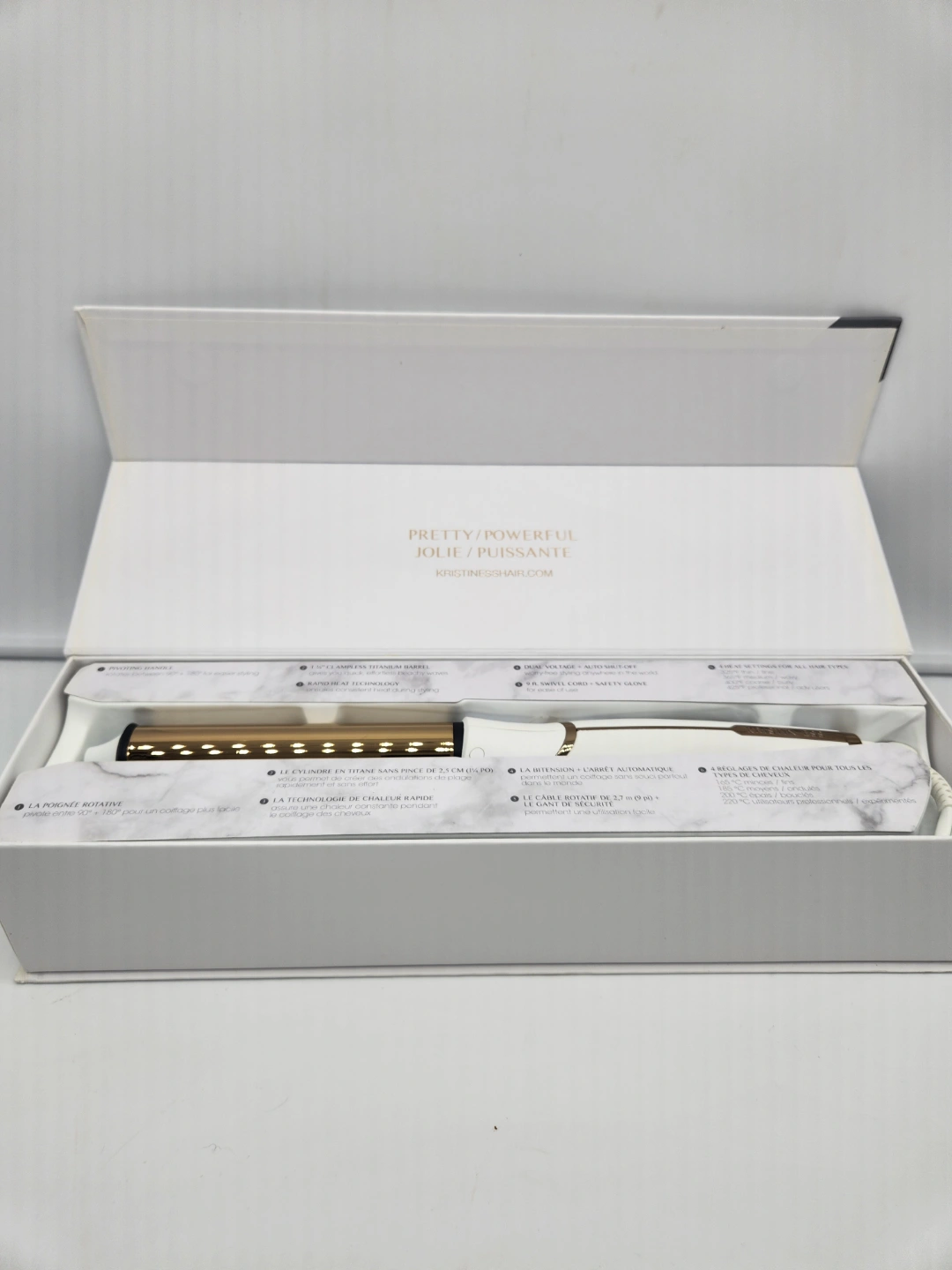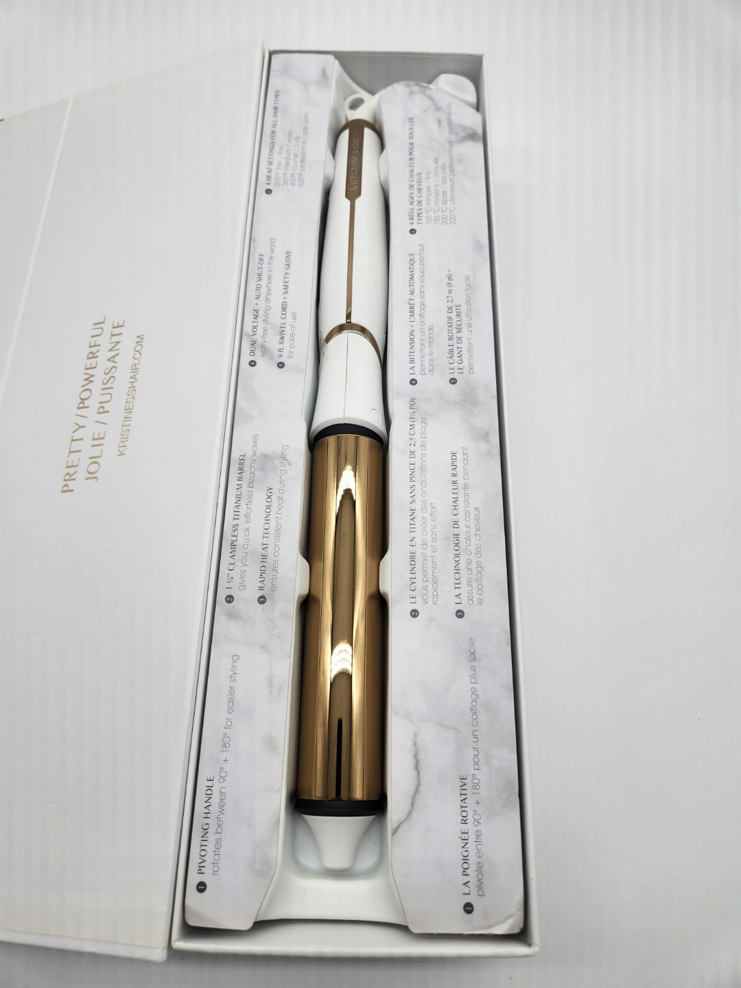 New, in box. Gold and white curling iron. Pivoting cord. Pretty/Powerful. 1-inch barrel.
