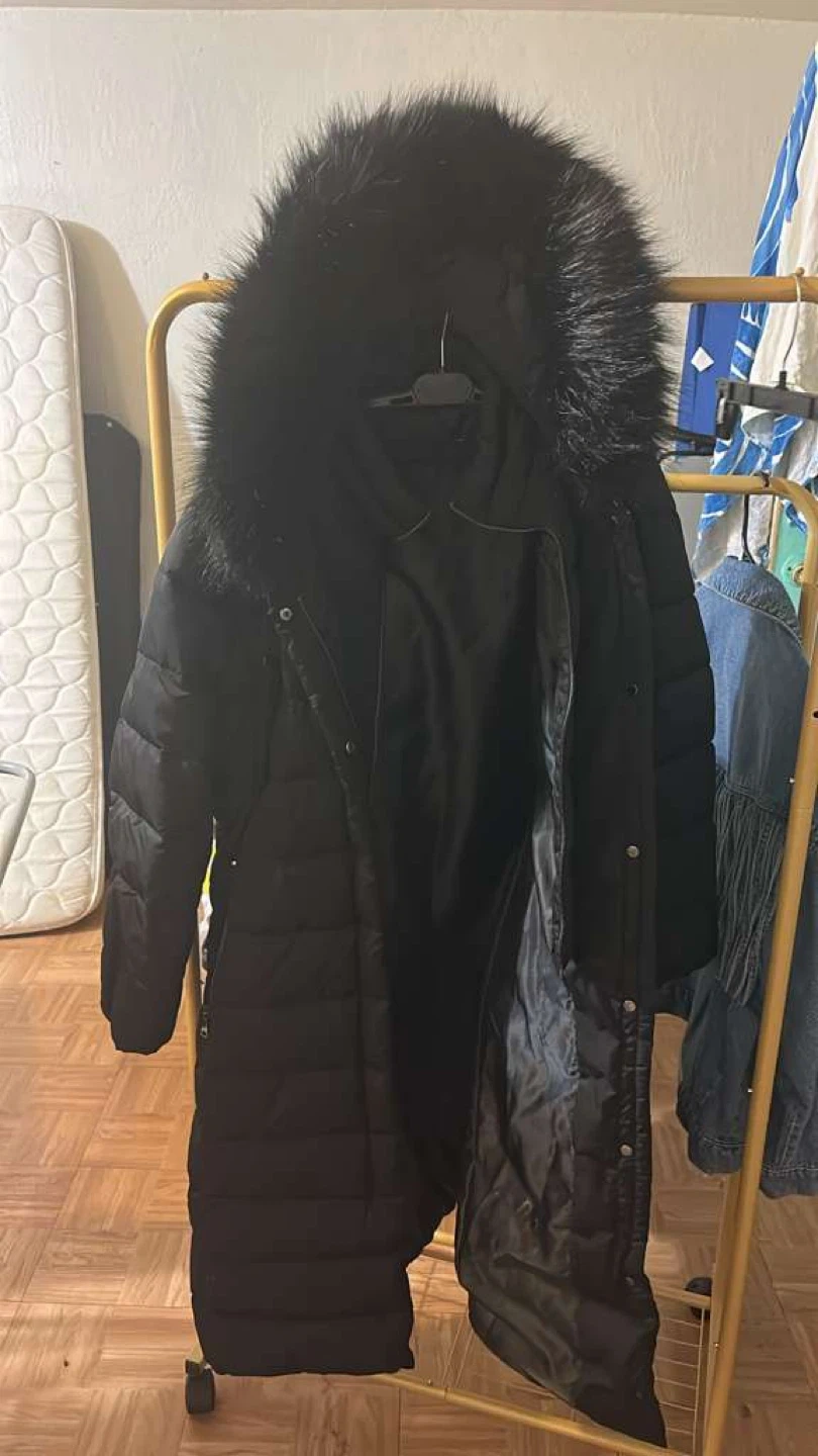 Long black puffer coat with a large, faux fur-lined hood. It's fully lined and has a zip-up front. This coat is designed for warmth.