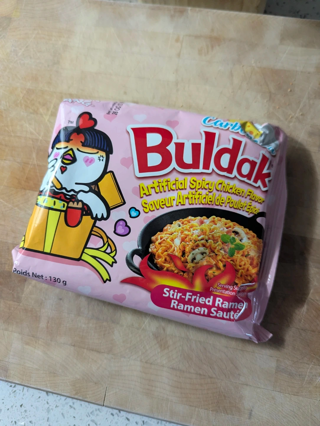 This is Buldak Artificial Spicy Chicken Flavor Stir-Fried Ramen. It's a 130g package. The best before date is 26 OCT 13.