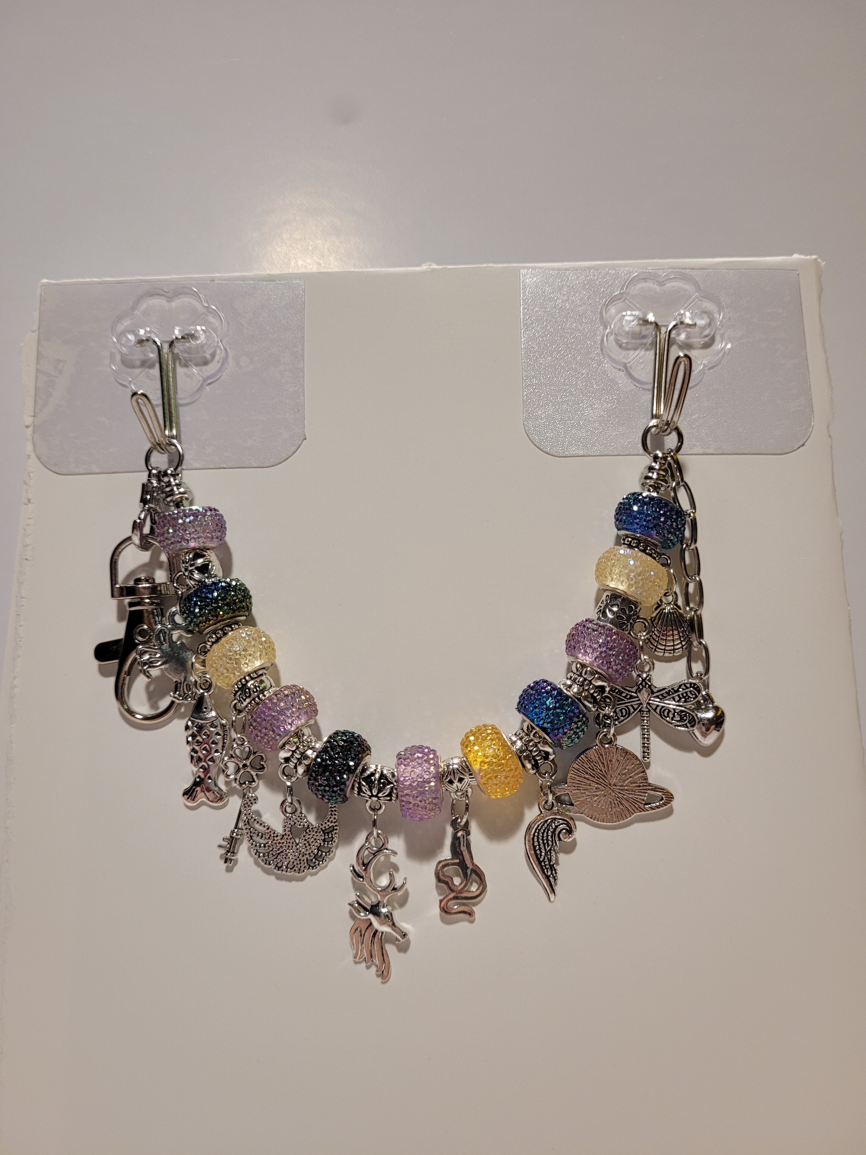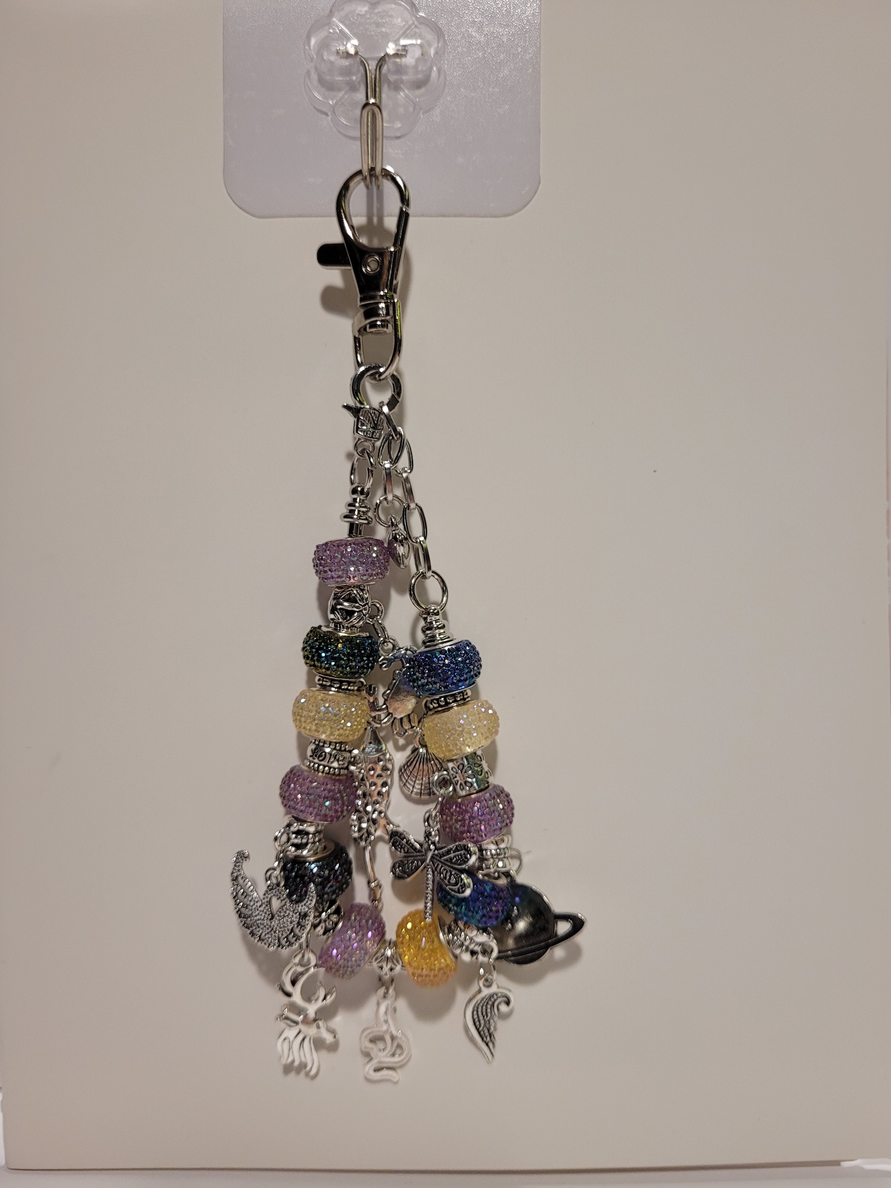 Check out this unique handmade keychain! It features a variety of colourful beads and silver charms, perfect for adding a personal touch to your keys or bag