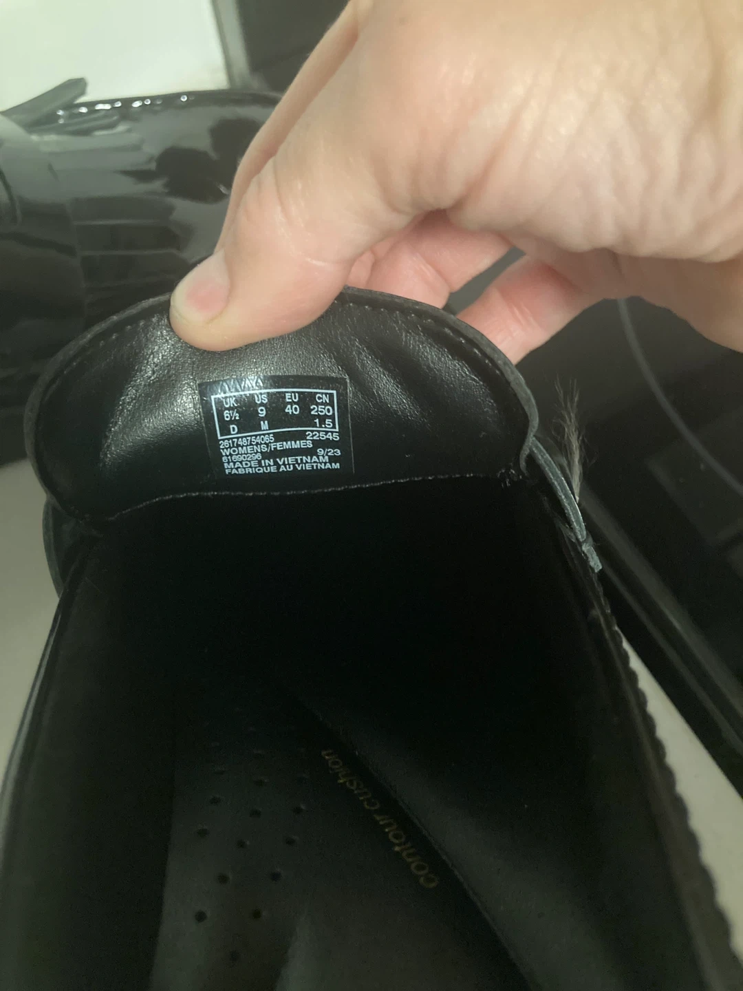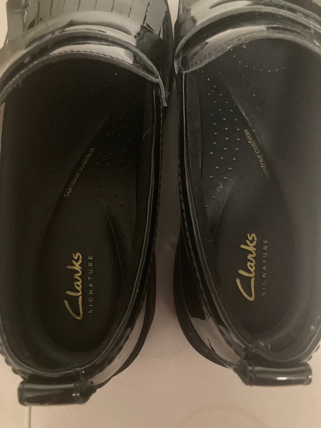 Clarks Signature loafers in a shiny black patent finish. They're designed with contour cushion for comfort. These slip-on shoes are great for everyday wear. Worn ONCE for fashion shoot