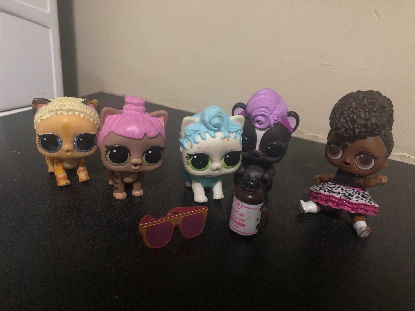 Cute bundle of five LOL Surprise collectible figures, featuring animal themes. Includes two cat dolls, a skunk doll, and a human-like doll. They're ready for playtime!