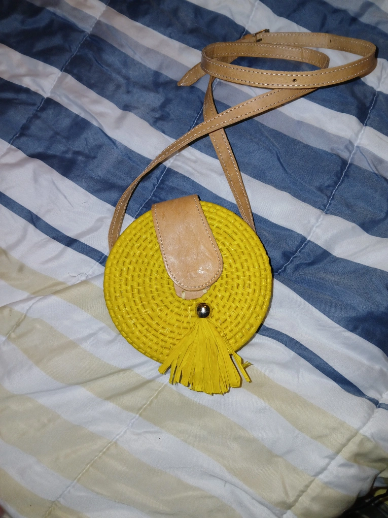 Pink woven raffia bag from Madagascar with a brown leather strap and closure. The bag is round and has a shell flower design on the front. I also have it in taupe and yellow. The yellow bag has a tasell on the front, and they are all the same size. The strap can be adjusted to 3 lenghths. Still in their original box's. A fabulous addition to any wardrobe.