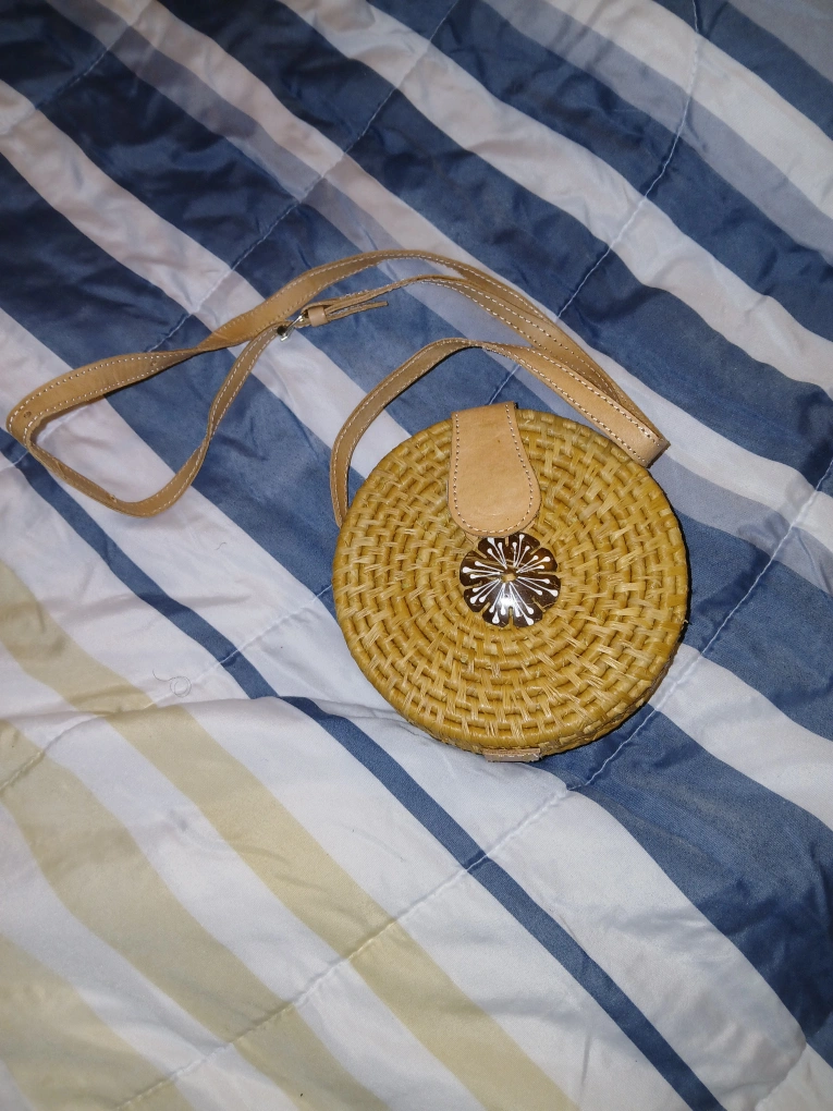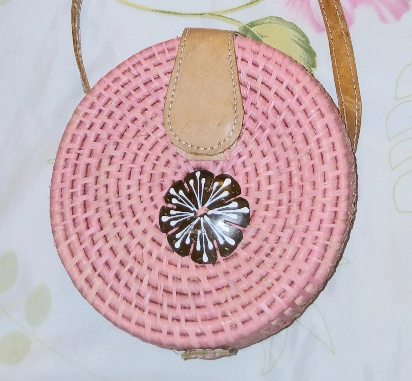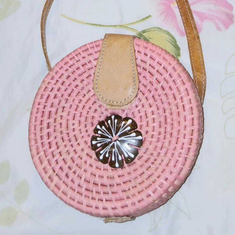 Pink woven raffia bag from Madagascar with a brown leather strap and closure. The bag is round and has a shell flower design on the front. I also have it in taupe and yellow. The yellow bag has a tasell on the front, and they are all the same size. The strap can be adjusted to 3 lenghths. Still in their original box's. A fabulous addition to any wardrobe.