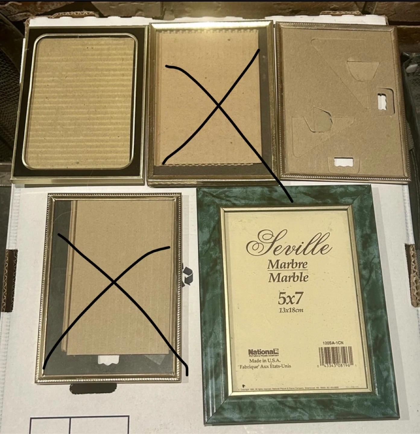 I'm offering a set of five picture frames, each designed to hold 5x7 inch photos. These frames are in used condition and vary slightly in style, from classic gold trim to a more modern green marble effect. They're perfect for displaying your cherished memories!
