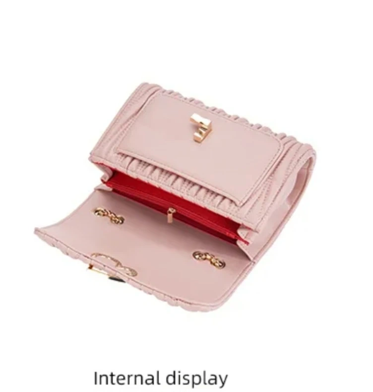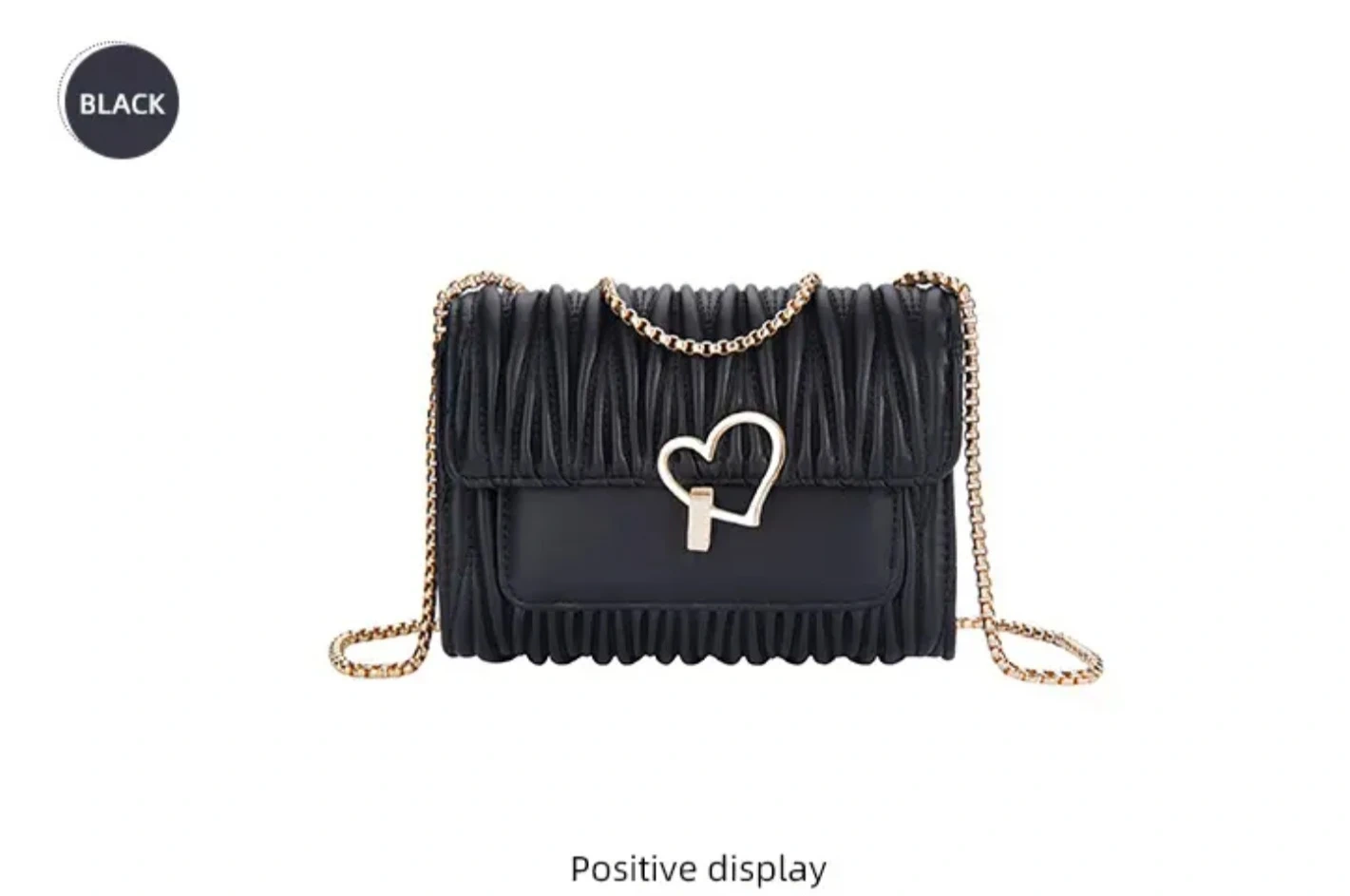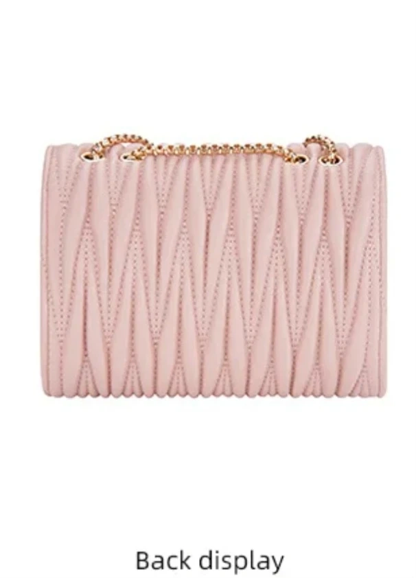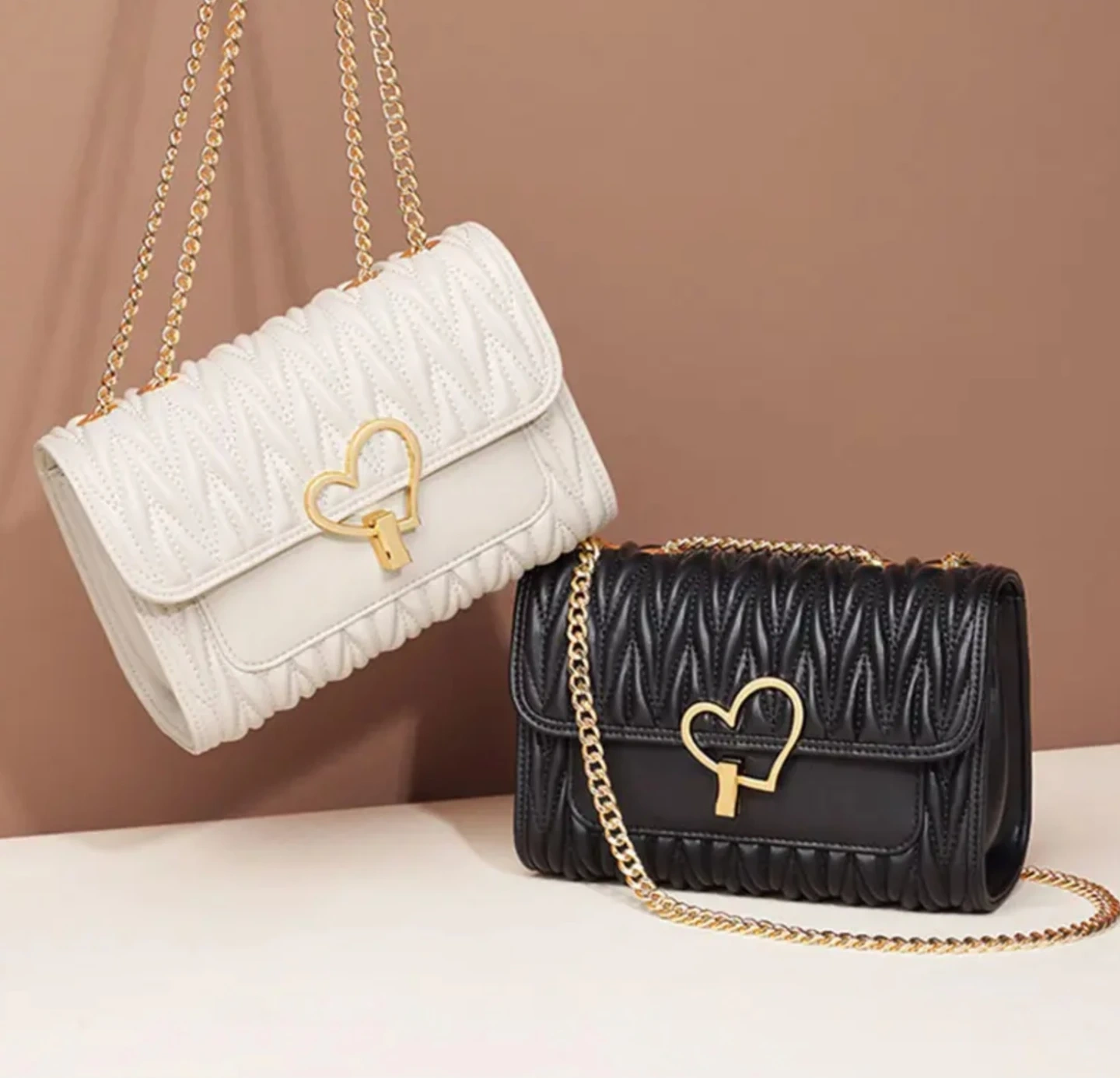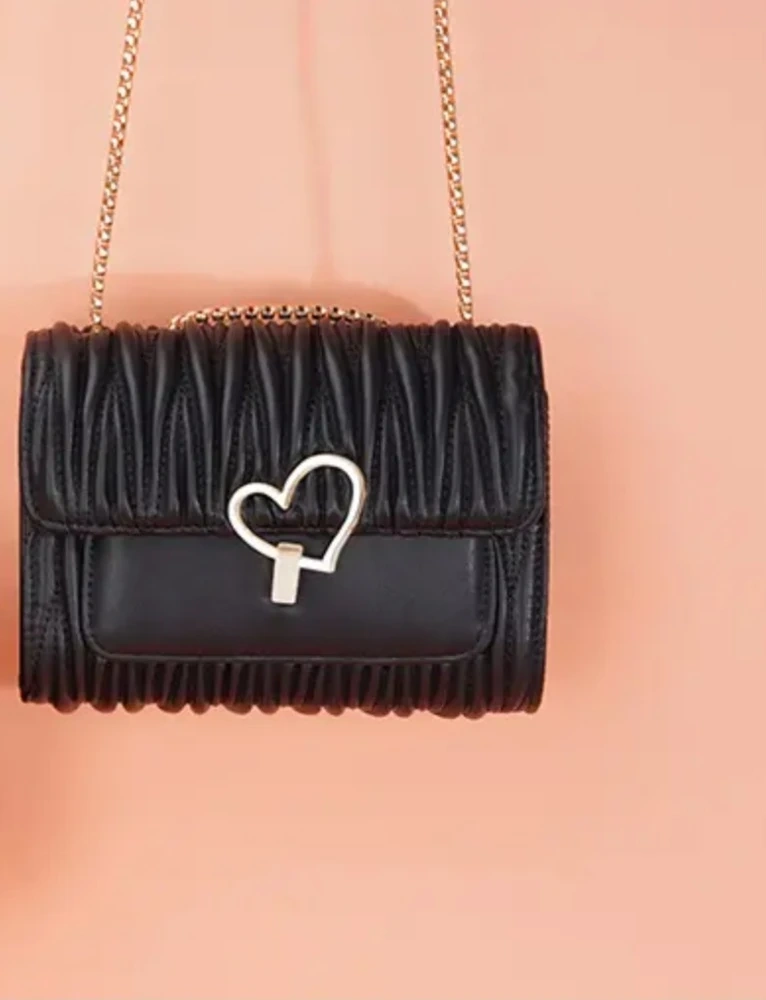 Women's crossbody bag with a gold-tone chain strap and a cute heart-shaped clasp. It's got a textured, ruched flap design. Available in Black , Off-white, and Pink