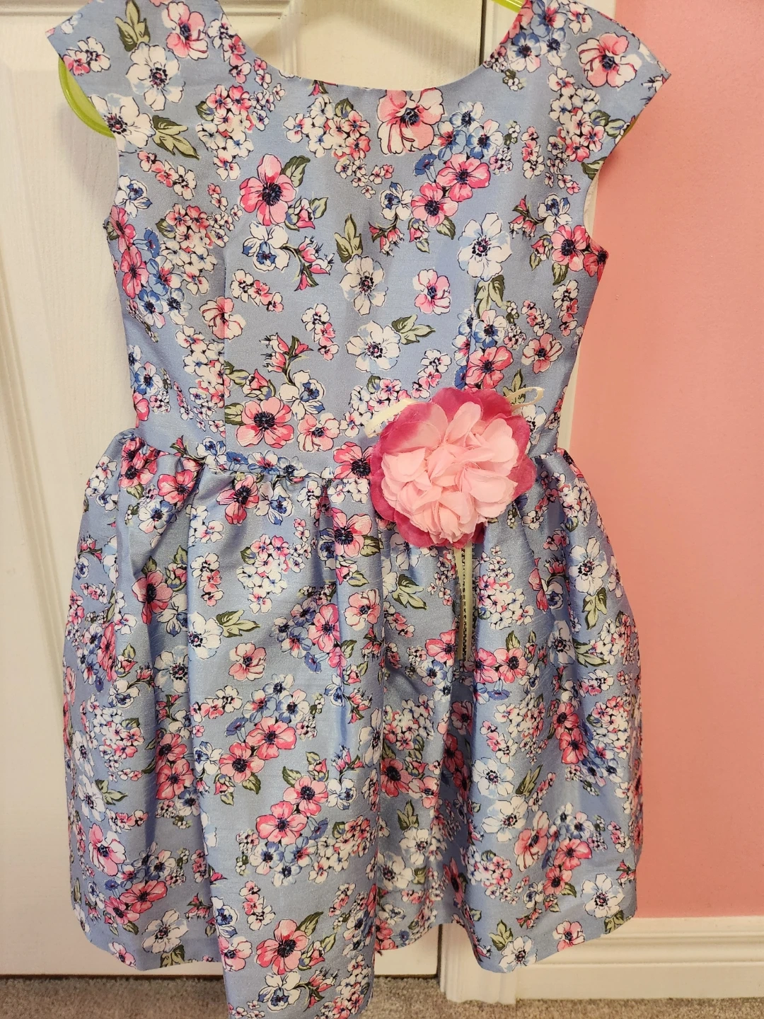 A lovely light blue dress for a girl, covered in a floral pattern with pink and white flowers. It features a pretty pink flower accent on the waist. Made from a satiny fabric. Perfect for parties or special occasions!