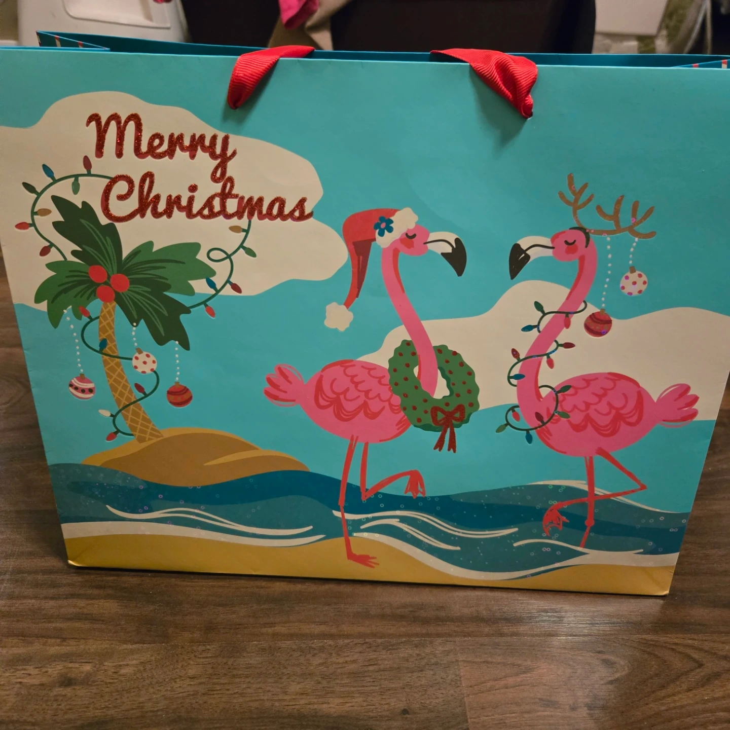 This festive gift bag features a "Merry Christmas" message and a fun tropical flamingo and snowman design. It includes a small bag of tissue paper. Great for holiday presents!