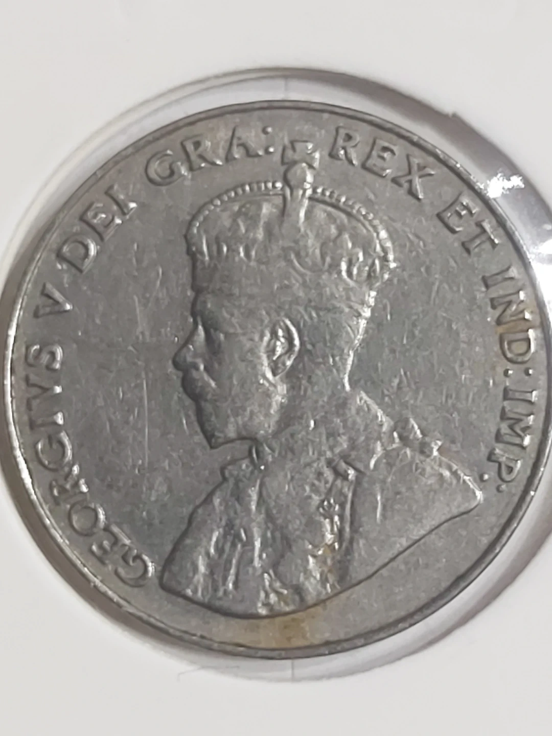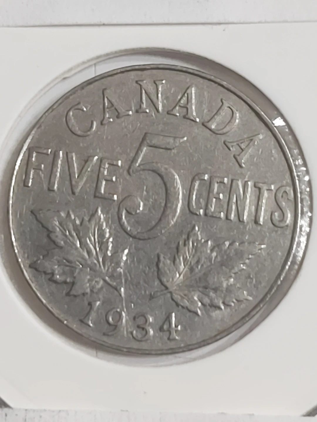 This is a 1934 Canadian 5 cent coin featuring King George V. It's a rare find for coin collectors. The coin is made of nickel.