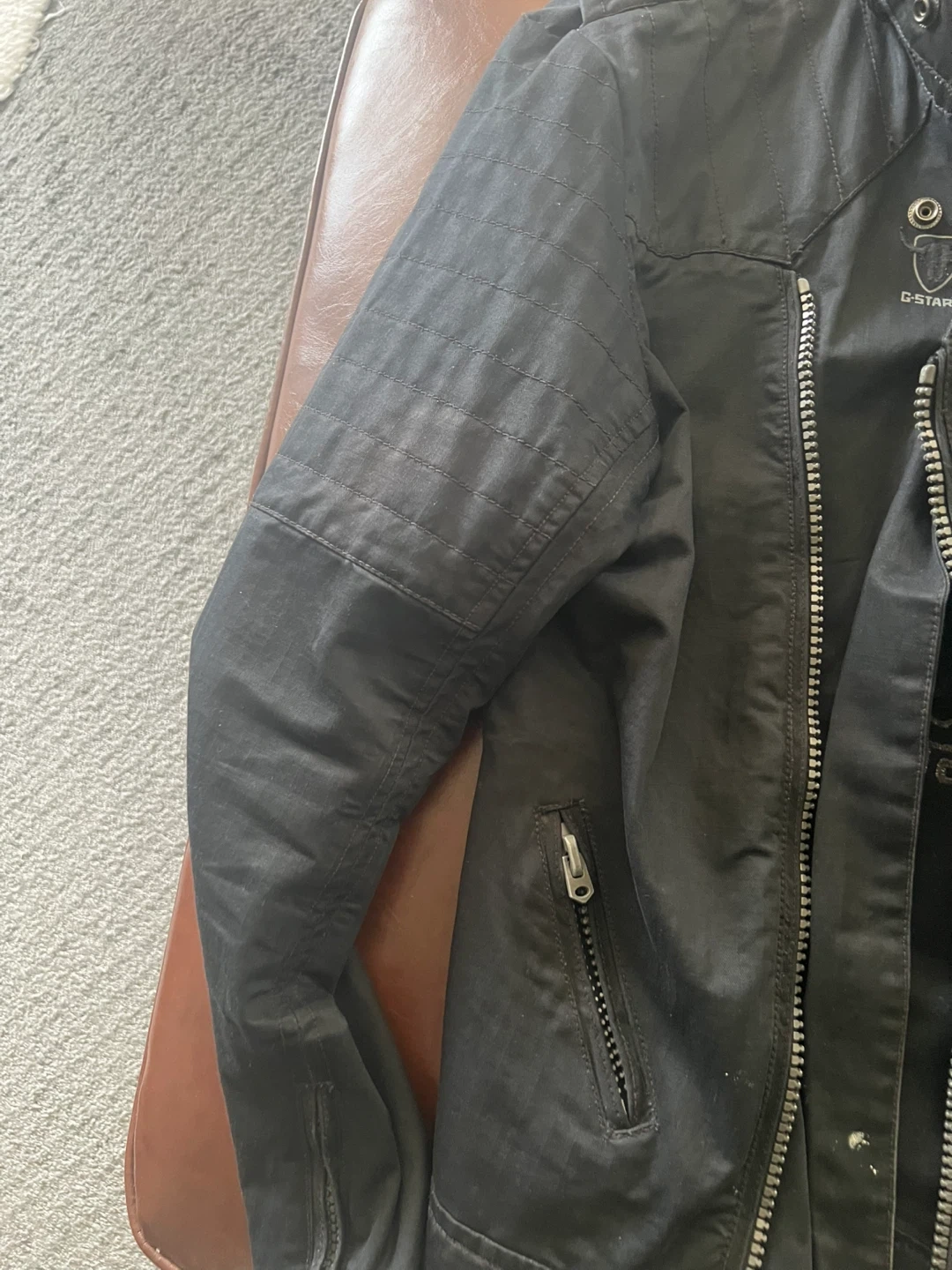 Selling a G-Star RAW black jacket in size M. It's a stylish jacket with a unique design and the G-Star logo. Overall it's in great condition and ready for a new owner!