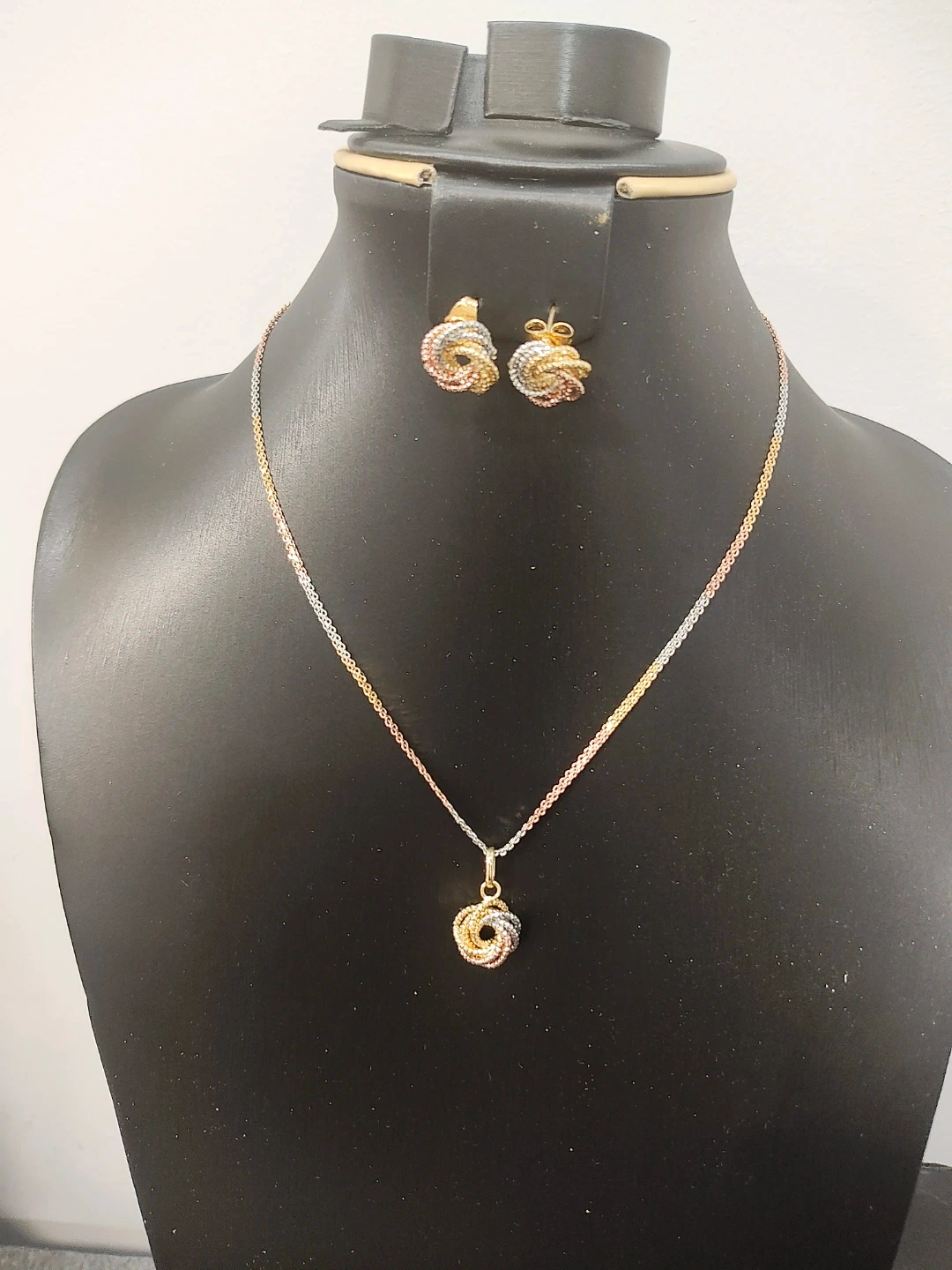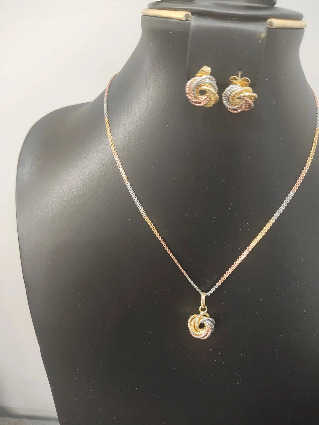 Tri-tone knot pendant necklace and earring set