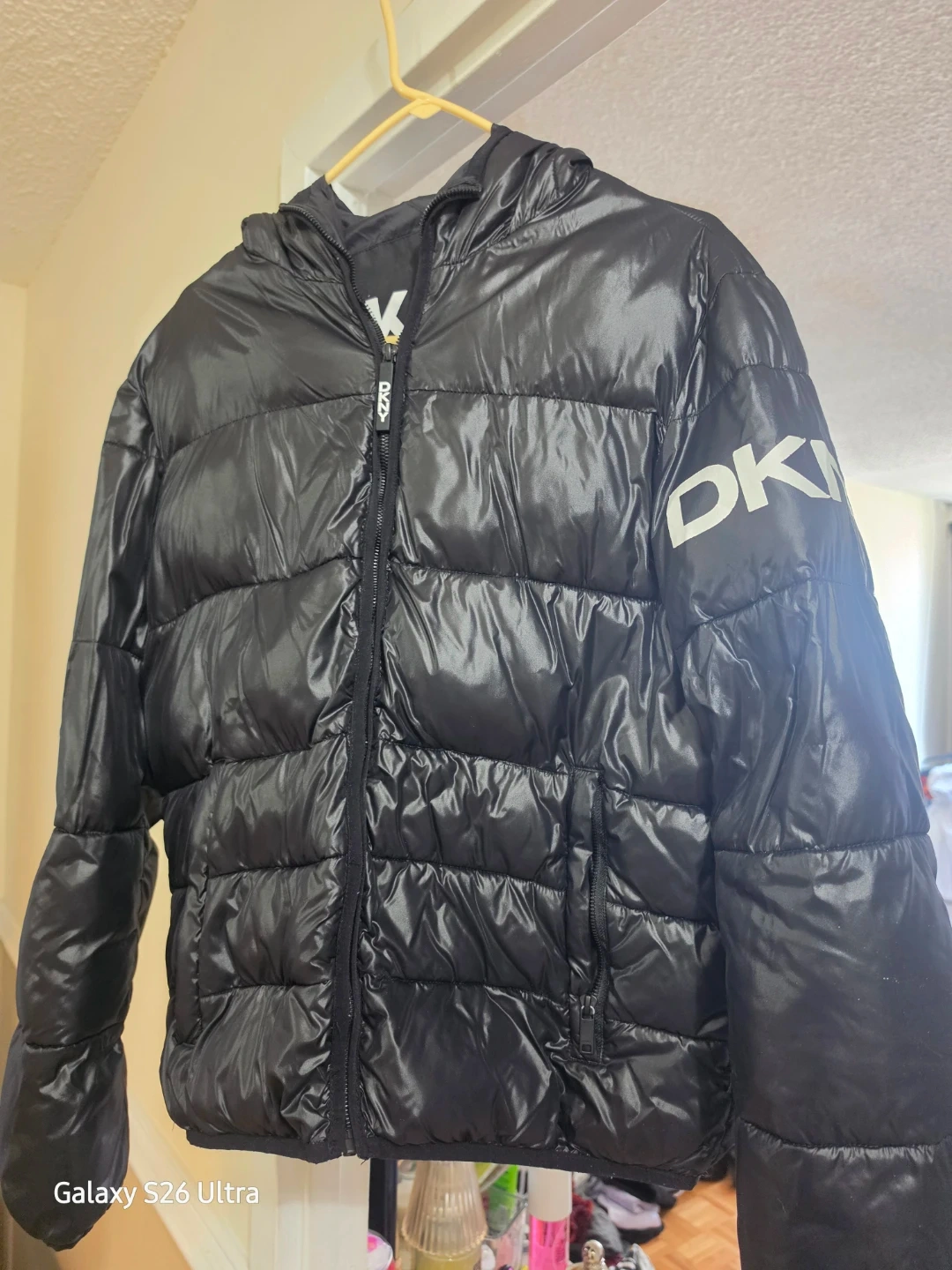 A black DKNY puffer jacket. It's a size medium. This jacket has a shiny, water-resistant finish and a comfortable hood. Perfect for cooler weather!