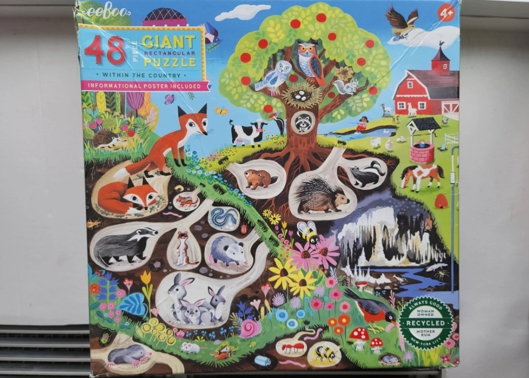 I'm selling a brand new eeBoo Giant Rectangular 48-piece puzzle! It's still in its original packaging. The puzzle is designed for ages 4+ and includes an informational poster. It's always good, woman owned, and recycled!