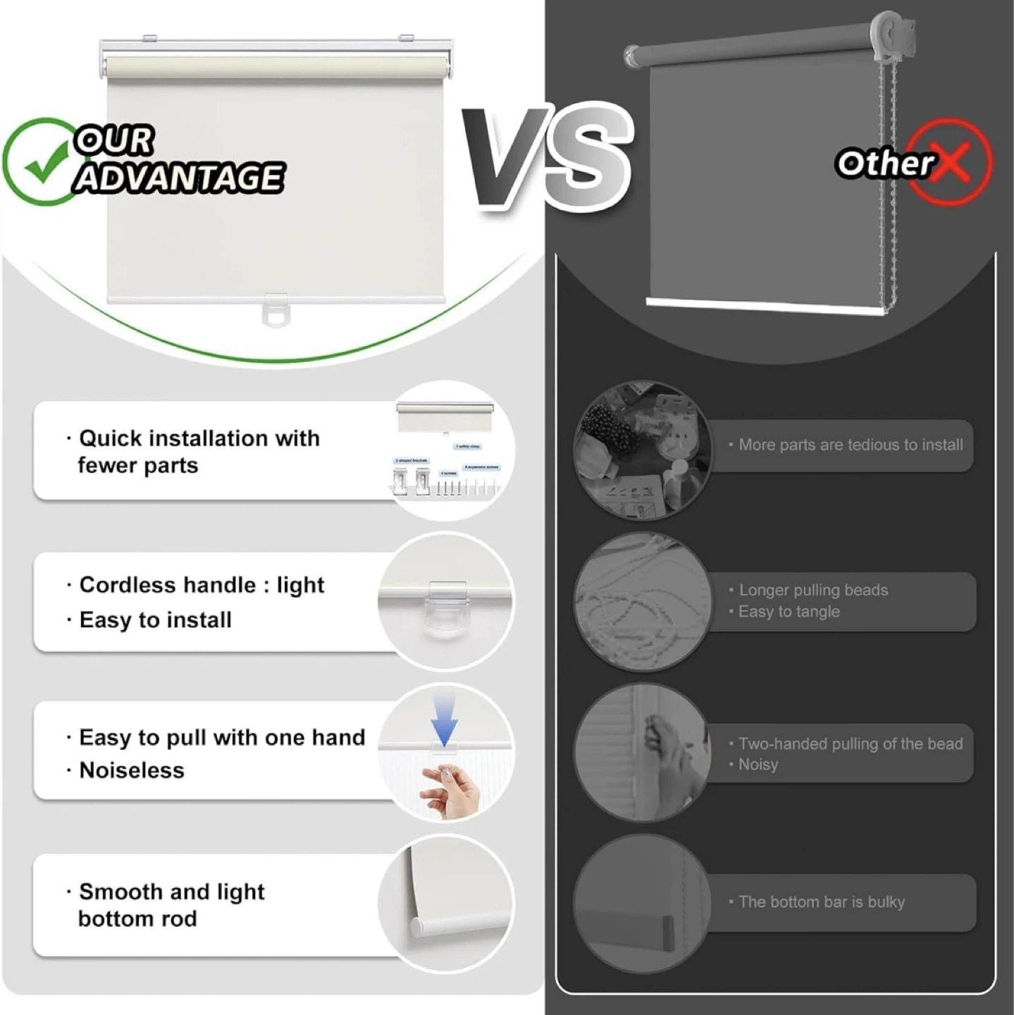 This is a light filtering roller shade, great for privacy and light control. It features a cordless design for easy operation and quick installation. The fabric is composed of a shading layer, black coating for anti-UV protection, and a color coating for thermal insulation. The shade is 72 inches in height.