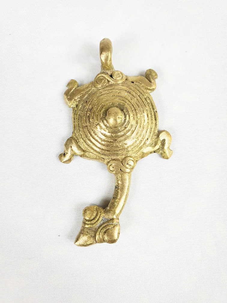 A beautiful African Brass pendant Jewelry, shaped like a turtle. Perfect for adding a touch of elegance to any ensemble, this pendant is sure to captivate the eye.