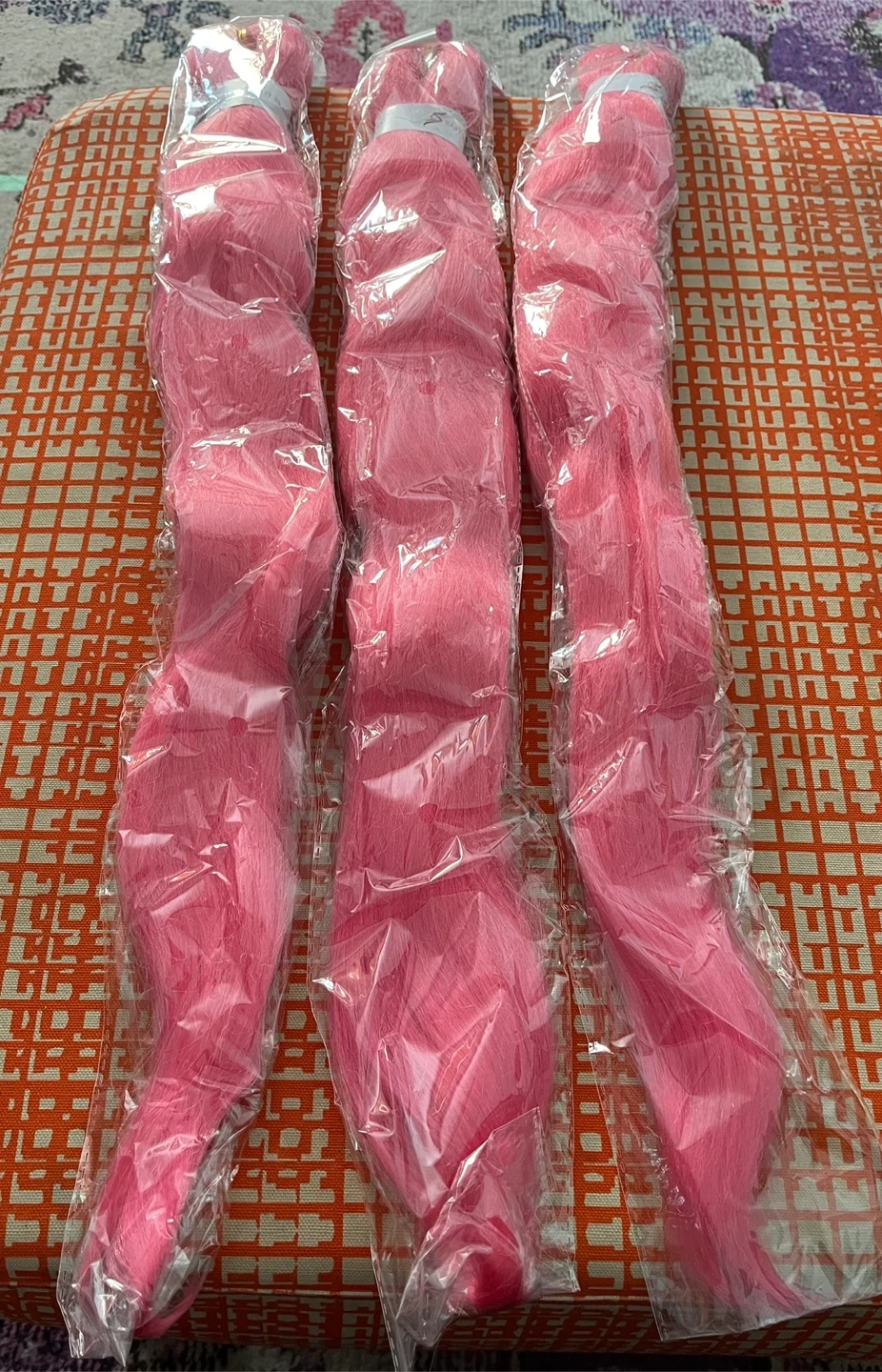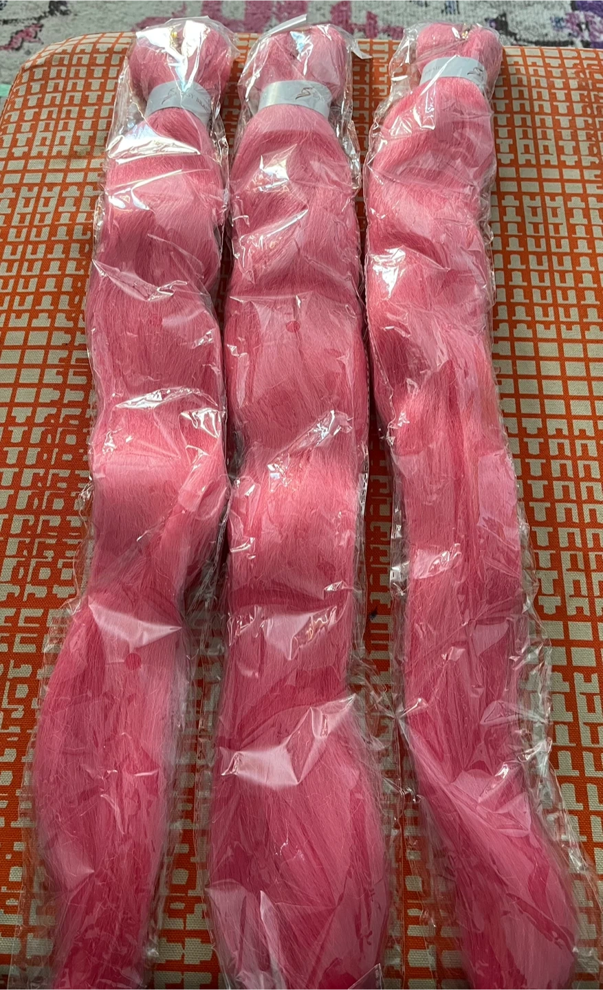 This is a set of three packs of BALING HAIR pre-stretch braiding hair. The colour is a vibrant light pink. It's designed for easy braiding and styling.