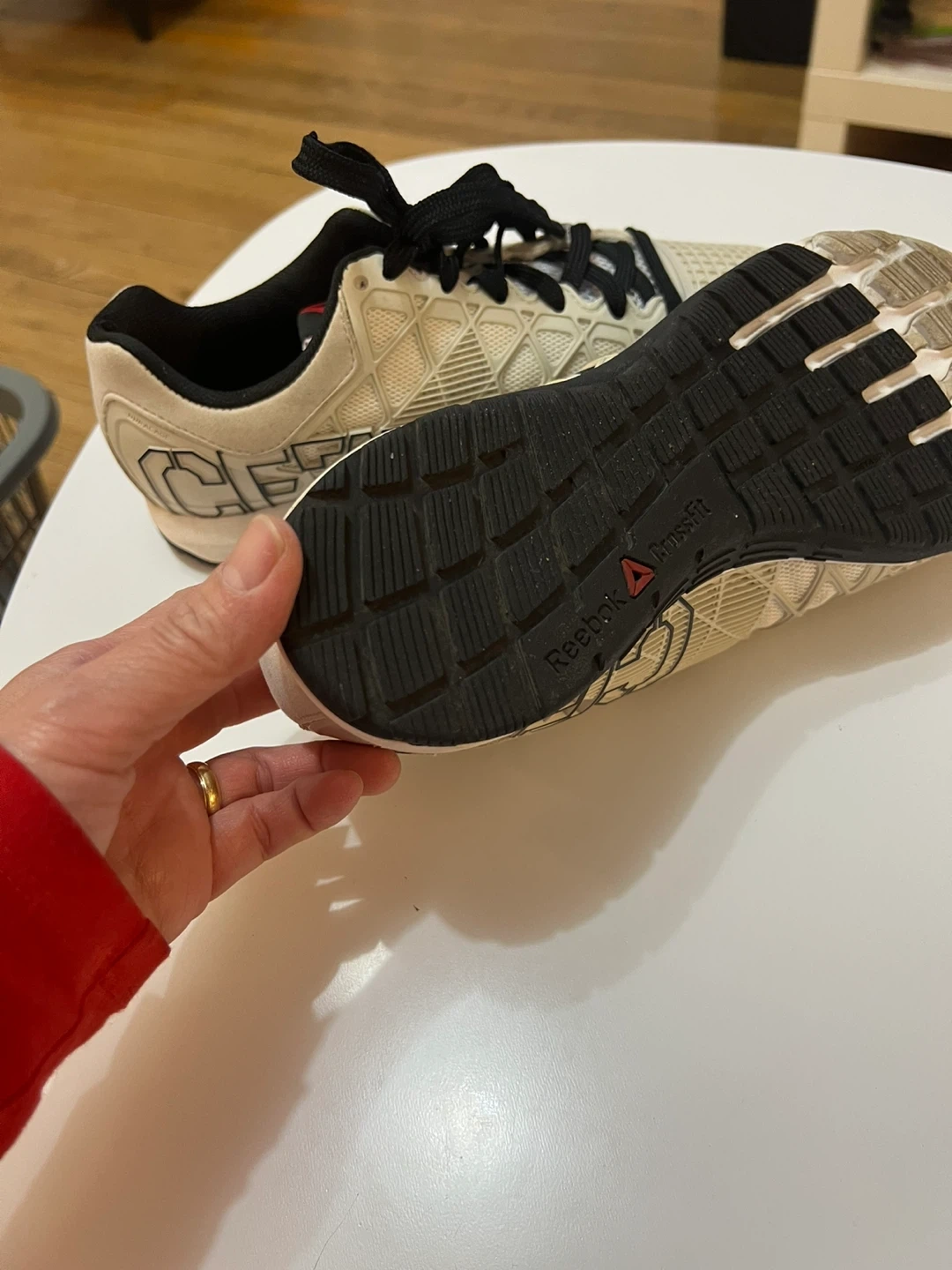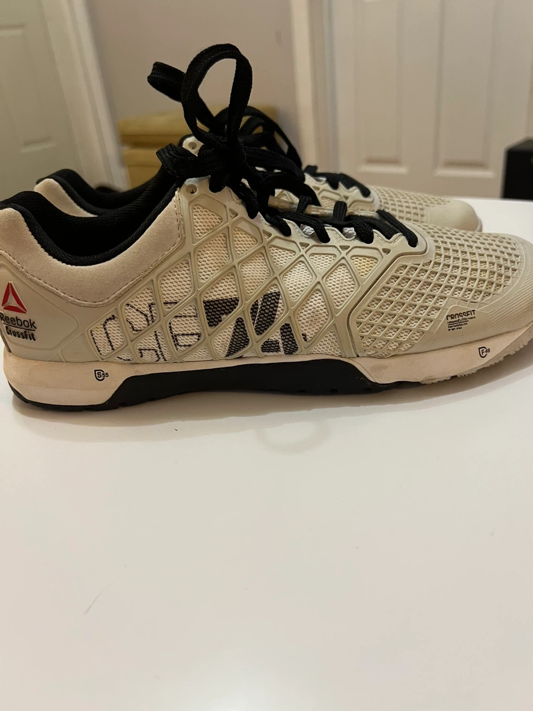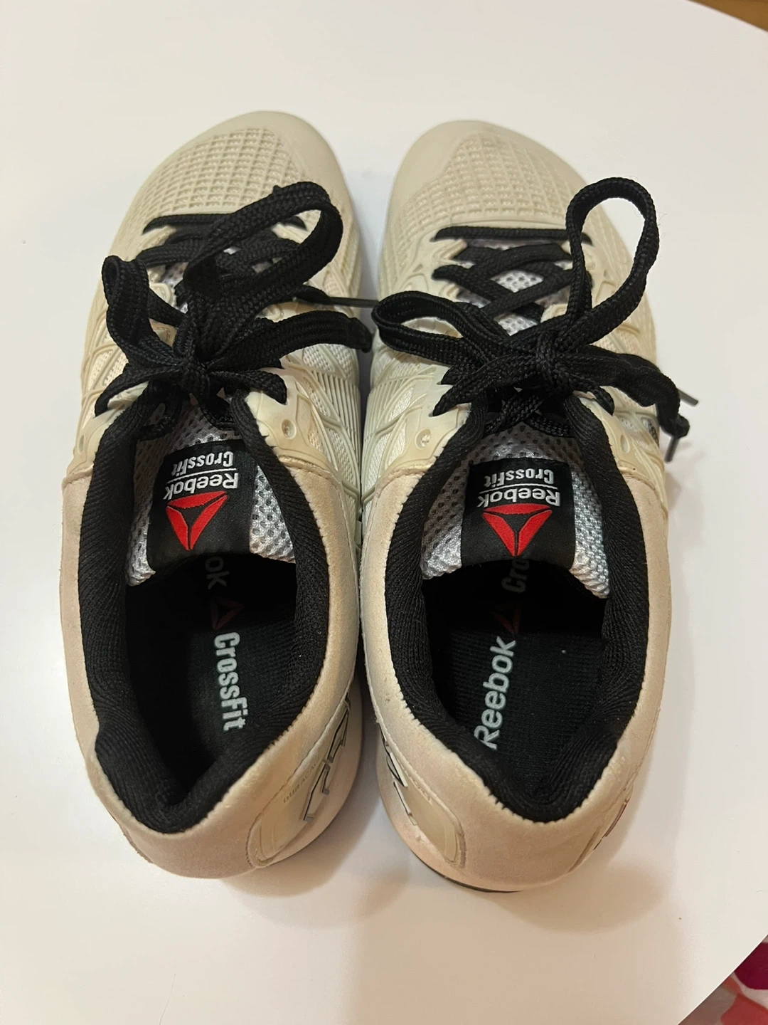 These Reebok CrossFit Nano shoes are designed for training. They're a beige colour with black laces and accents. The soles provide good grip for workouts. Size 9.