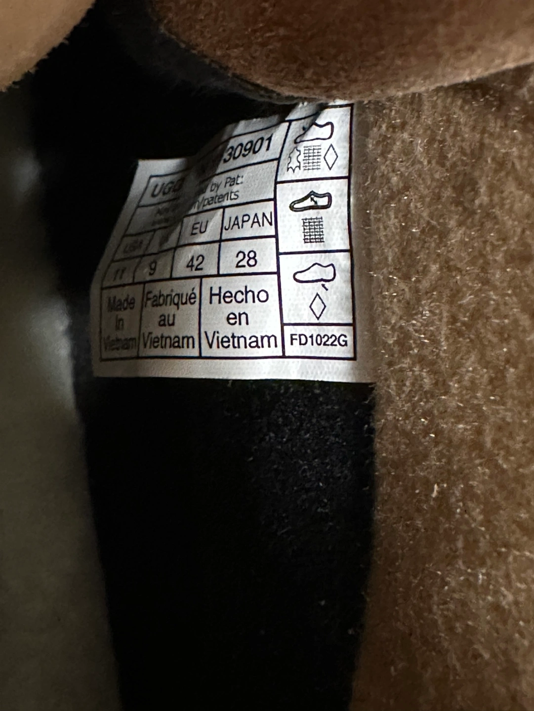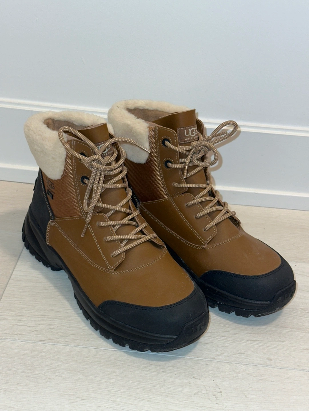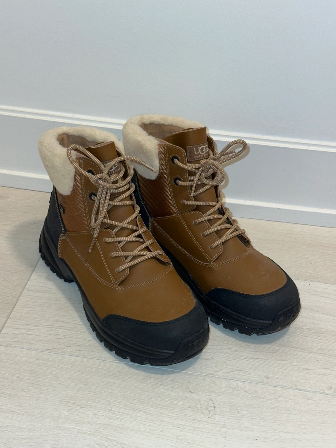 Tan leather lace-up boots with black soles and a sheepskin lining. Worn but in good condition. Getting rid of cause I got a new pair of another type of boot. Fits 11 women or 9.5 men. Open to all offers!