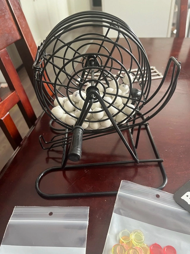 Get ready to shout BINGO with this complete bingo game set! This used set includes a sturdy metal cage, numbered balls, bingo cards, and colourful markers. Everything you need for a fun game night with family and friends. While this set has brought joy to many gatherings, it's now looking for a new home to continue the winning streak. Embrace the thrill of the game, because if the ad is up, the bingo balls are still rolling! Cash accepted.