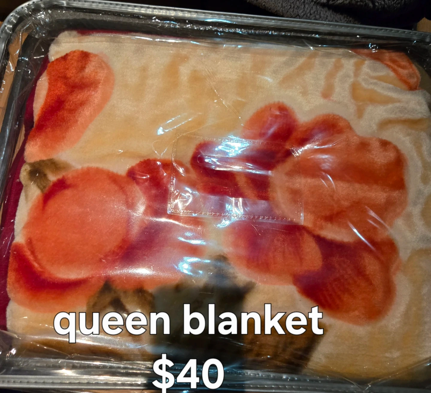 This queen-sized blanket features a lovely floral pattern in warm tones. It's soft and cozy, perfect for adding a touch of comfort to any bedroom. The blanket is in its original packaging.