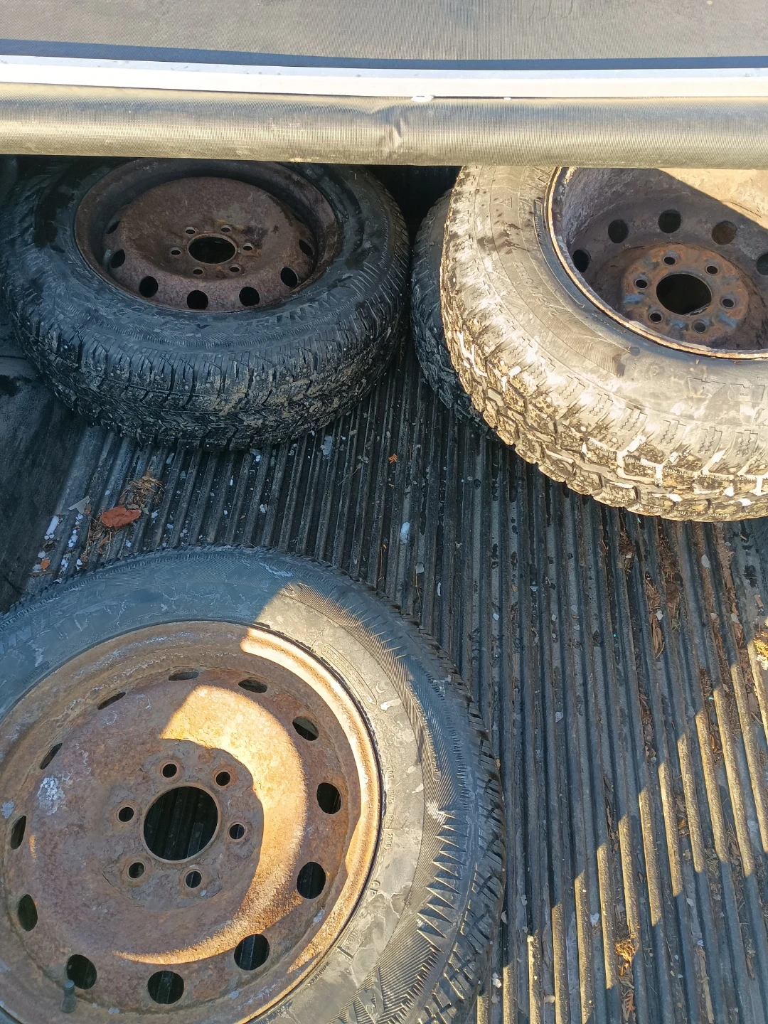 Three used winter tires on steel rims. Tire size is 245/70R17. Great for snowy conditions! Came off of the Ford F-150