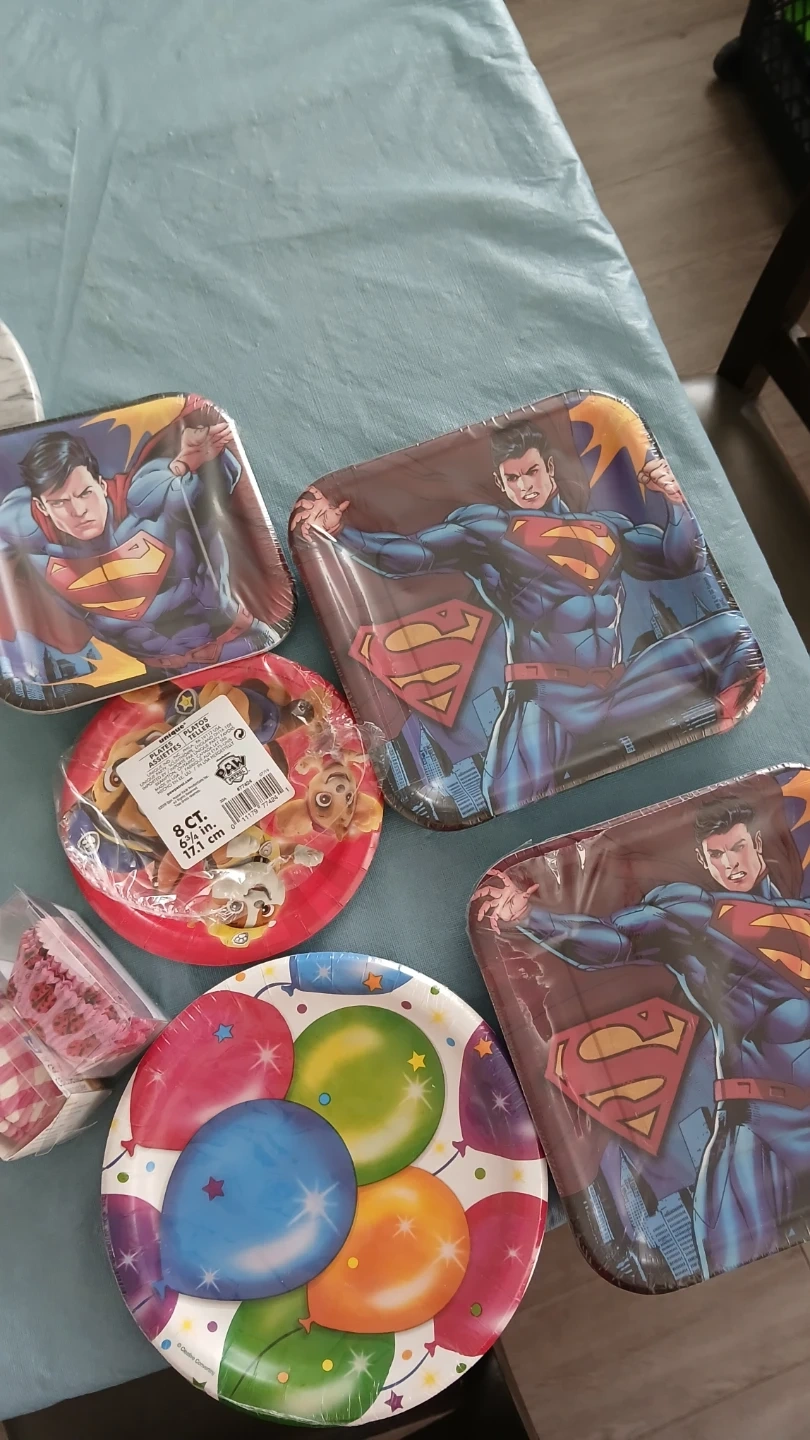Includes Superman square plates, Paw Patrol round plates, and balloon-themed plates. Also includes pink cupcake liners. Great for kids' birthday parties!