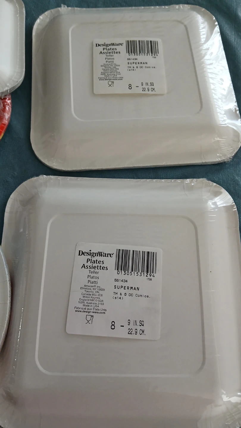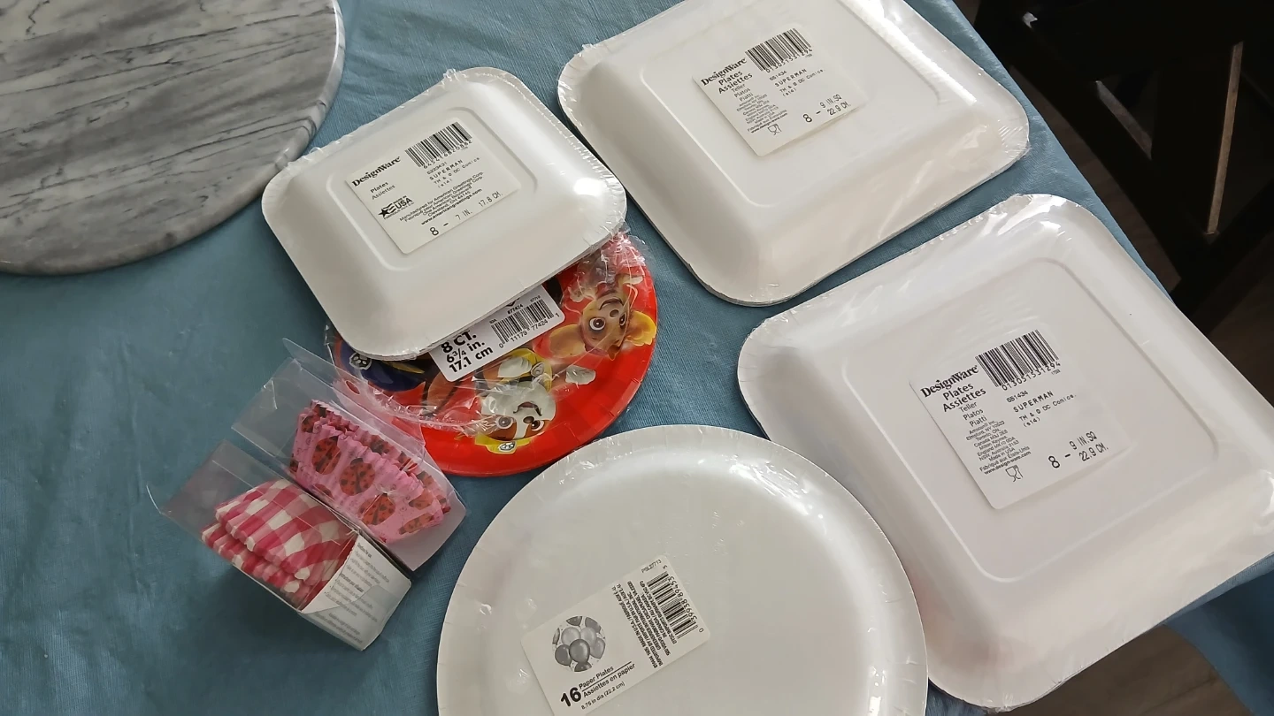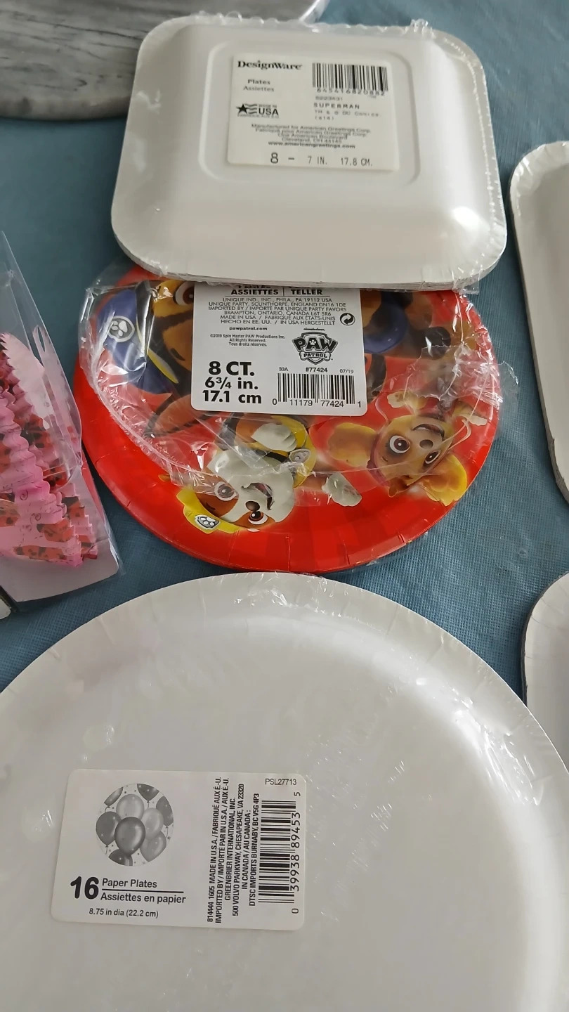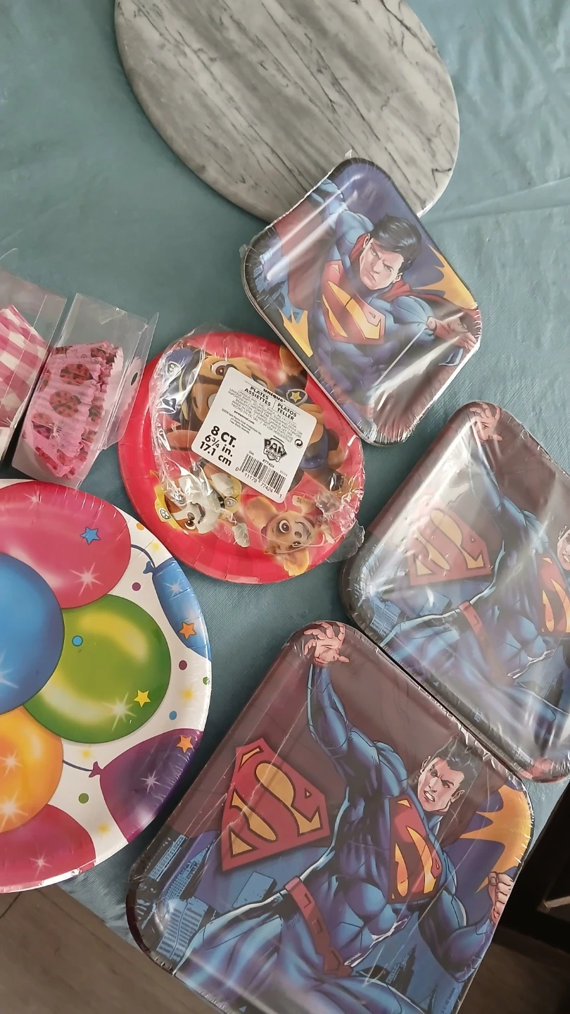 Includes Superman square plates, Paw Patrol round plates, and balloon-themed plates. Also includes pink cupcake liners. Great for kids' birthday parties!