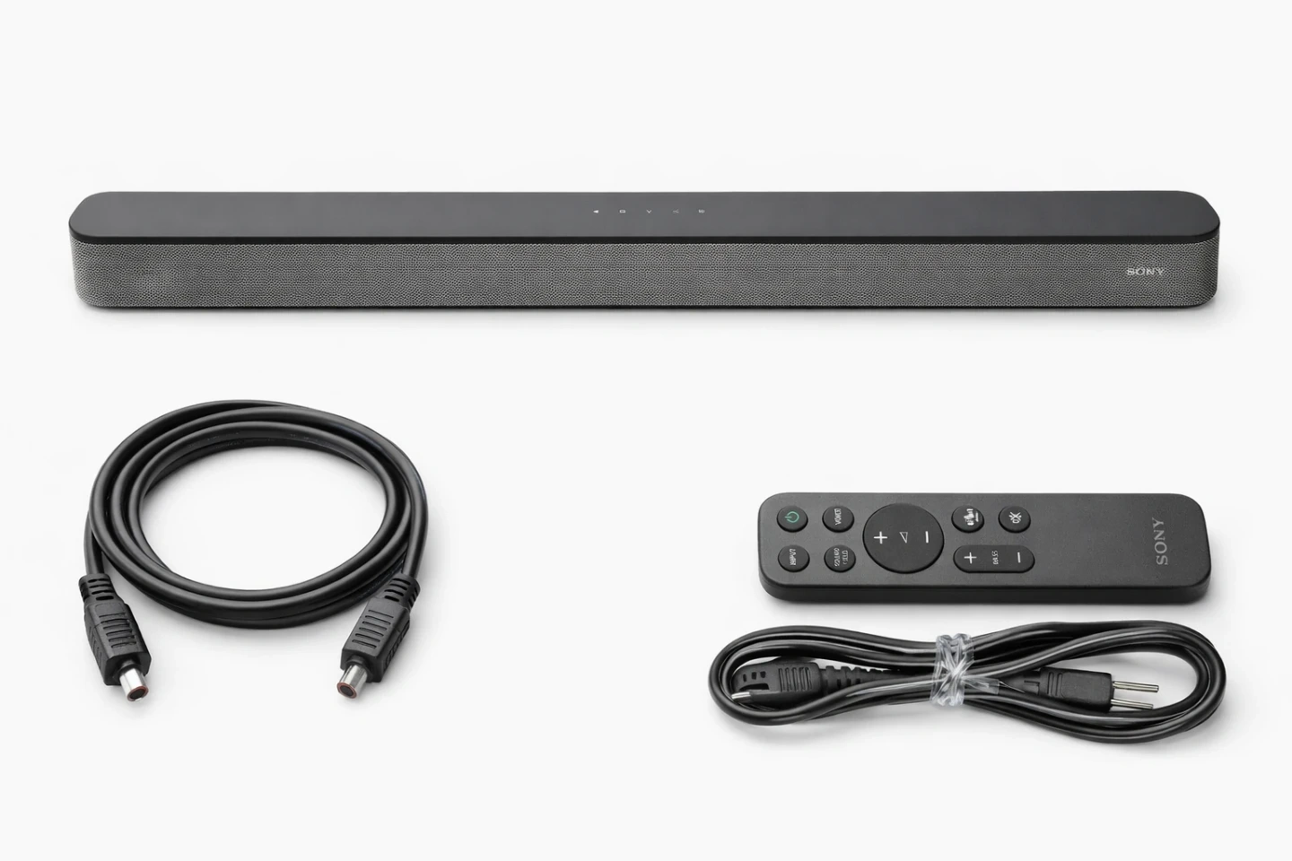 This is a black Sony soundbar. It comes with a remote control, an HDMI cable, and a power cord. It's perfect for enhancing your TV's audio experience. You'll get clearer sound for movies and music! Bought a new Samsung sound system but this one is still really awesome so I'm hoping someone will enjoy it as much as I did πͺπ½