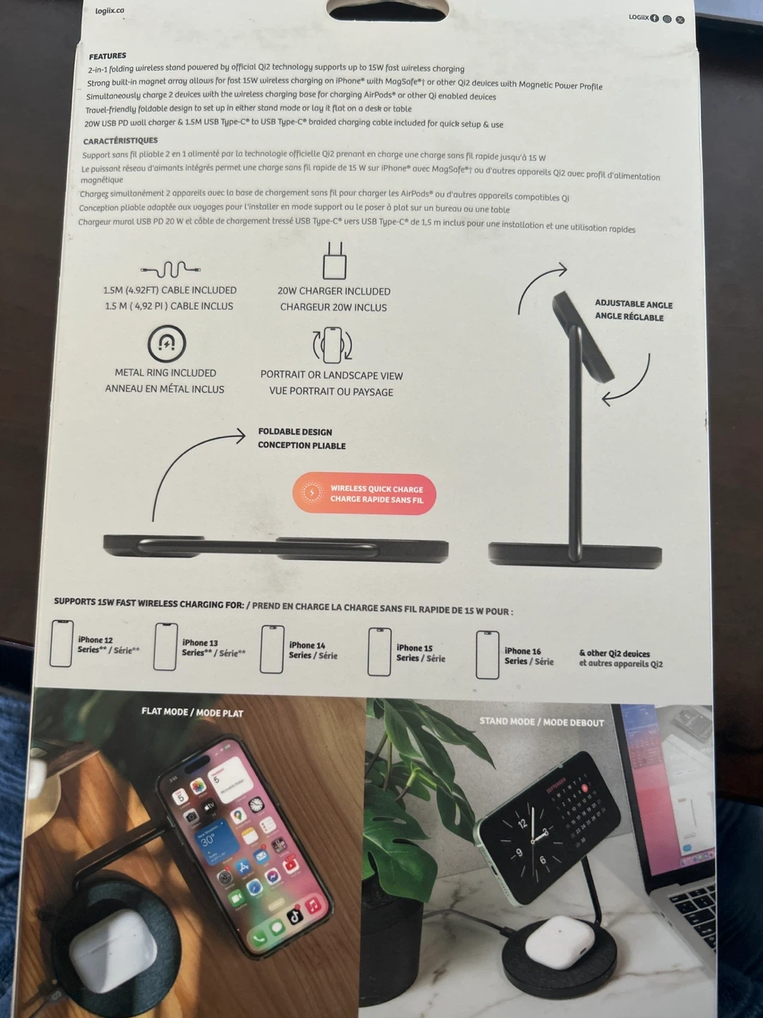 This 2-in-1 foldable wireless charging stand supports Qi2 MagSafe charging and a 5W Qi wireless charging base. It's designed for charging up to two devices simultaneously, including a phone and AirPods or other Qi-enabled devices. The stand supports 15W fast wireless charging for iPhones and has a magnetic ring included for metal attachments. It also features a foldable design for portability and includes a charger with a braided USB-C cable.