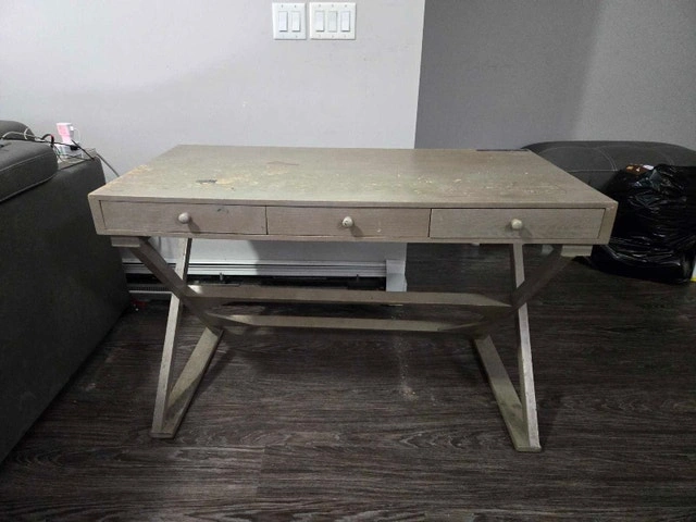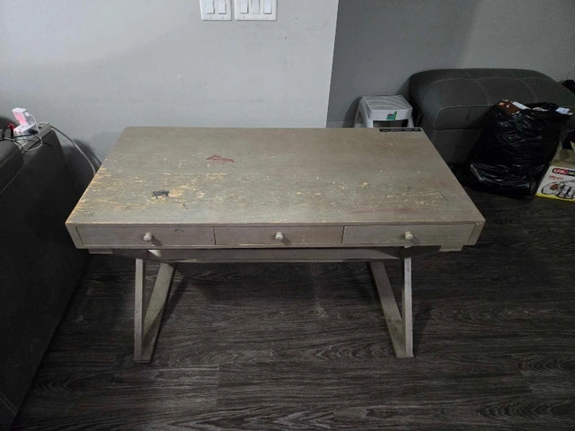 This wooden desk (47x23.5x30 inches) offers a sturdy and functional workspace, perfect for adding a touch of rustic charm. It has three drawers for organization. With a bit of care, this desk could truly shine! If you're seeing this ad, the desk is still available and waiting for a new home.