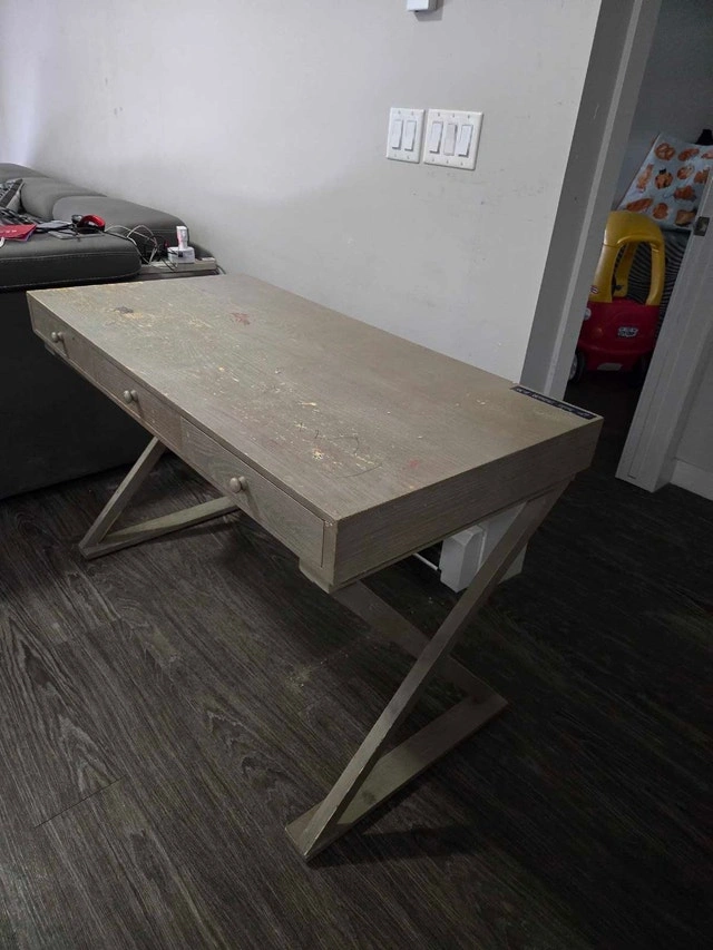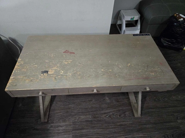 This wooden desk (47x23.5x30 inches) offers a sturdy and functional workspace, perfect for adding a touch of rustic charm. It has three drawers for organization. With a bit of care, this desk could truly shine! If you're seeing this ad, the desk is still available and waiting for a new home.