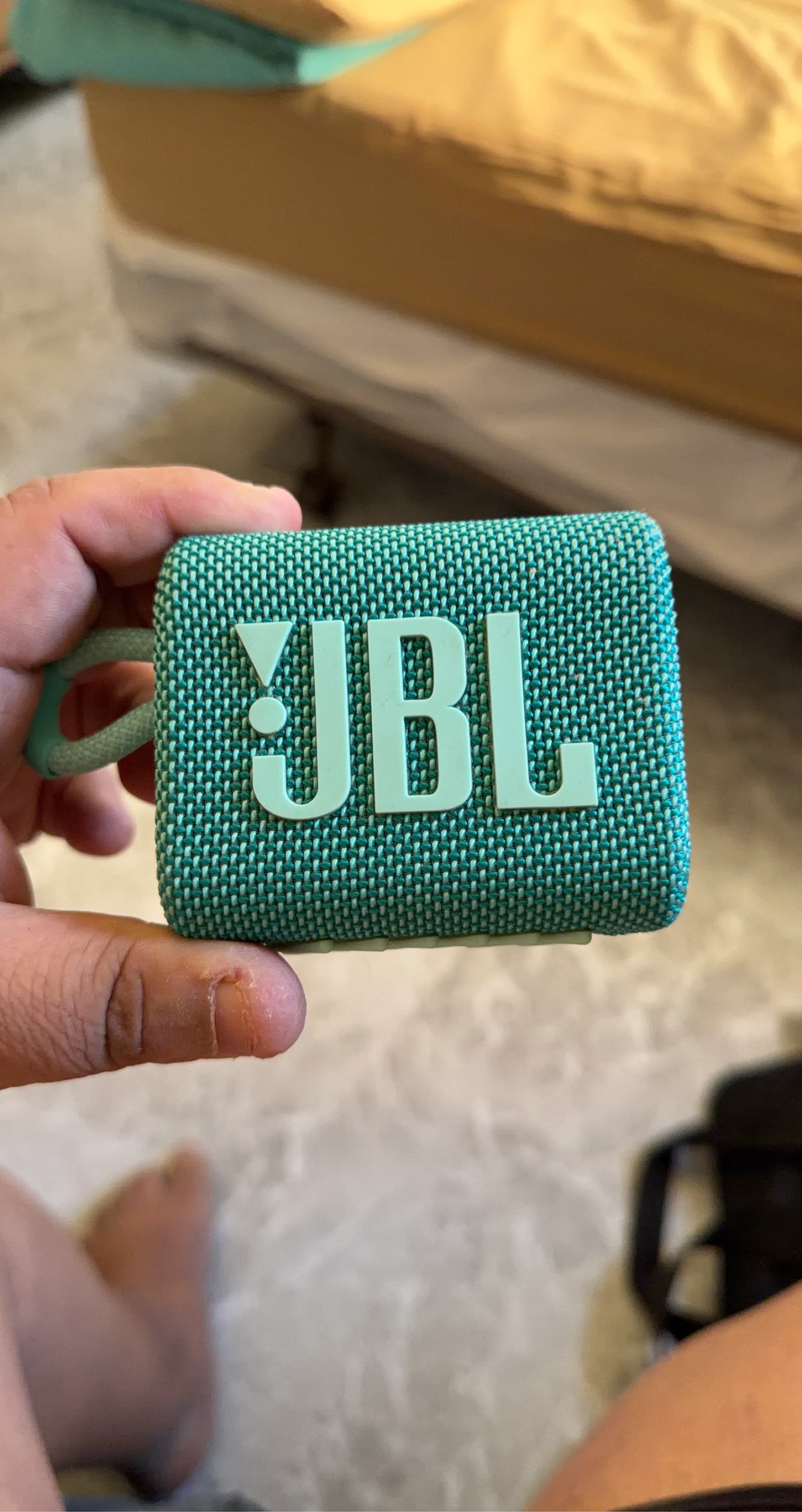 JBL Clip 4 portable speaker. It's waterproof and has Bluetooth. Teal color with fabric exterior. Includes a carabiner clip for easy carrying. Great for outdoor use!